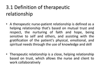 The therapeutic nurse-patient relationship (NPR) is defined as a helping relationship based on mutual trust and respect that assists the patient with their physical, emotional, and spiritual needs. The purposes of the NPR include facilitating communication, assisting with problem solving, and promoting self-care and independence. Key dimensions of the NPR include empathetic understanding, unconditional positive regard, therapeutic use of self, confidentiality, clear communication, and respect. The relationship progresses through pre-orientation, orientation, working, and termination phases with specific tasks for nurses in each phase such as establishing rapport, setting goals, and defining problems.