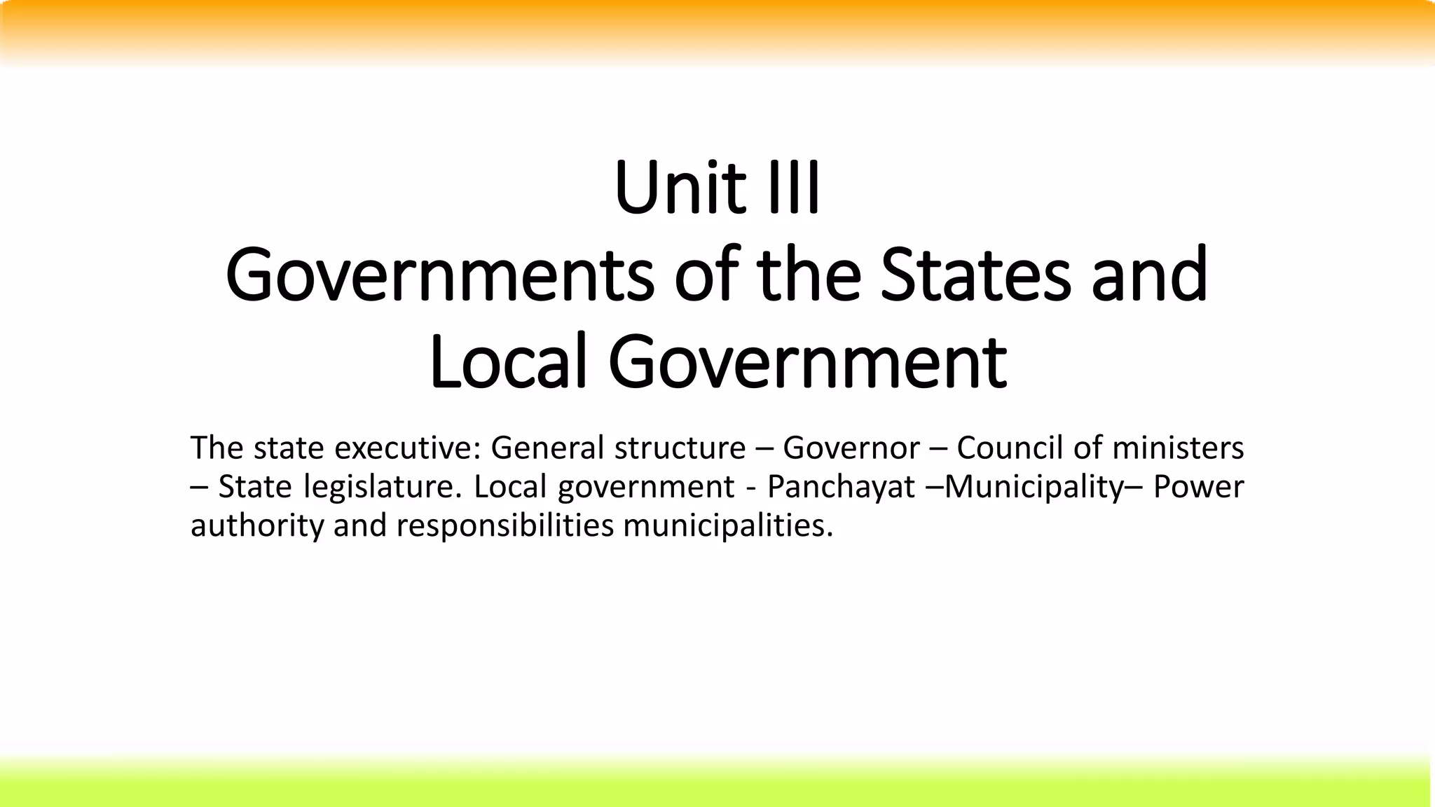 The document discusses the structure and functions of state governments in India. It describes that state governments have an executive branch composed of a governor and chief minister along with council of ministers. States have a legislative assembly elected for 5 years, with some states also having an upper house called the legislative council. Local governments are organized into districts, blocks and villages, with village councils, block councils and district councils. The roles and responsibilities of state governments include law and order, education, agriculture, finances and more.