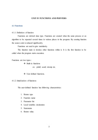The document discusses functions and pointers in C programming. It defines functions as reusable blocks of code that perform a specific task. Functions are declared with a return type, name, parameters, and body. Parameters can be passed by value or reference. Pointers are variables that store memory addresses. Pointer arithmetic and pointers with arrays are also covered. The document provides examples of different types of functions like those with and without return values and parameters. Recursion, where a function calls itself, and pointers are demonstrated through code examples.
