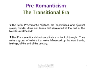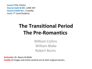 This document provides an overview of a poetry course, including details about the course title, code, credit hours, and level. It then summarizes some of the key pre-Romantic poets covered in the course, including William Collins, William Blake, and Robert Burns. These poets wrote in the late 18th century during the transitional period between Neoclassicism and Romanticism and incorporated Romantic themes and feelings while still adhering to some traditional forms.