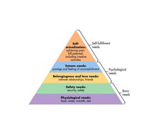 2. Maslow's Hierarchy of Needs suggests people must satisfy basic needs before pursuing higher level needs of esteem and self-actualization. Meeting each level of needs motivates pursuing the next.