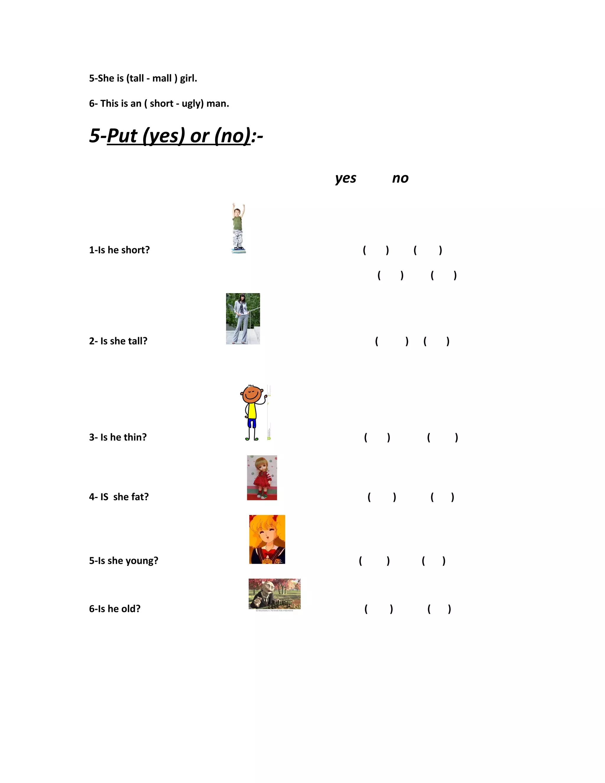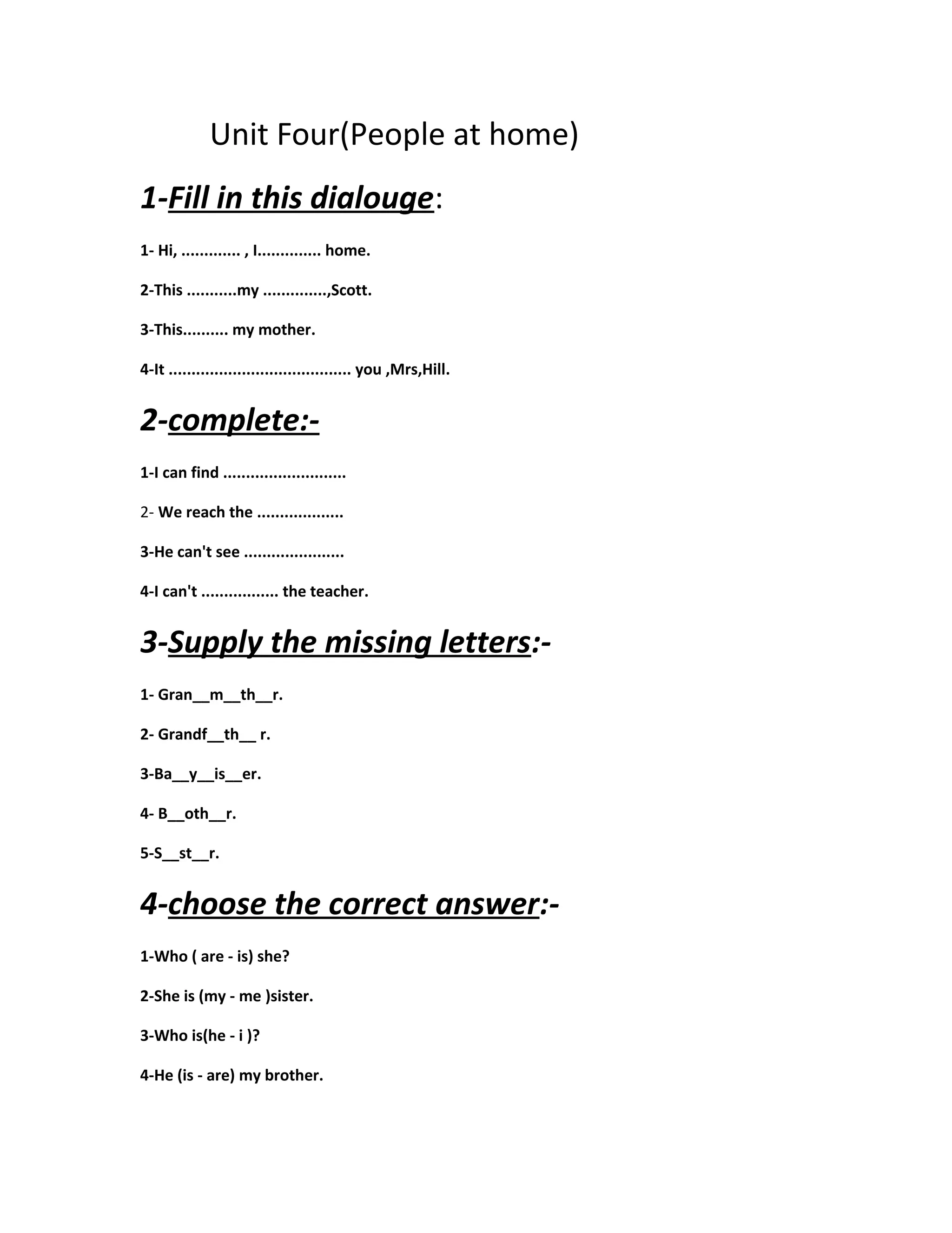 The document contains exercises about family members and describing people. It includes filling in dialogues, completing sentences, supplying missing letters in words, choosing the correct answers, and indicating yes or no for statements about people's appearances and characteristics. The exercises focus on learning and practicing vocabulary related to family relationships and physical descriptions.