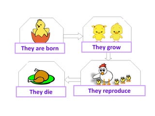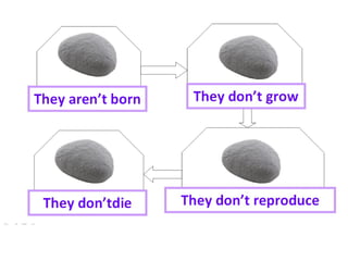 This document discusses the key differences between living and non-living things, noting that living things have vital functions like nutrition, interaction, reproduction, and respond to their environment in order to perform and survive, while non-living things do not. It also categorizes living things into the main kingdoms of plants, fungi, and animals.