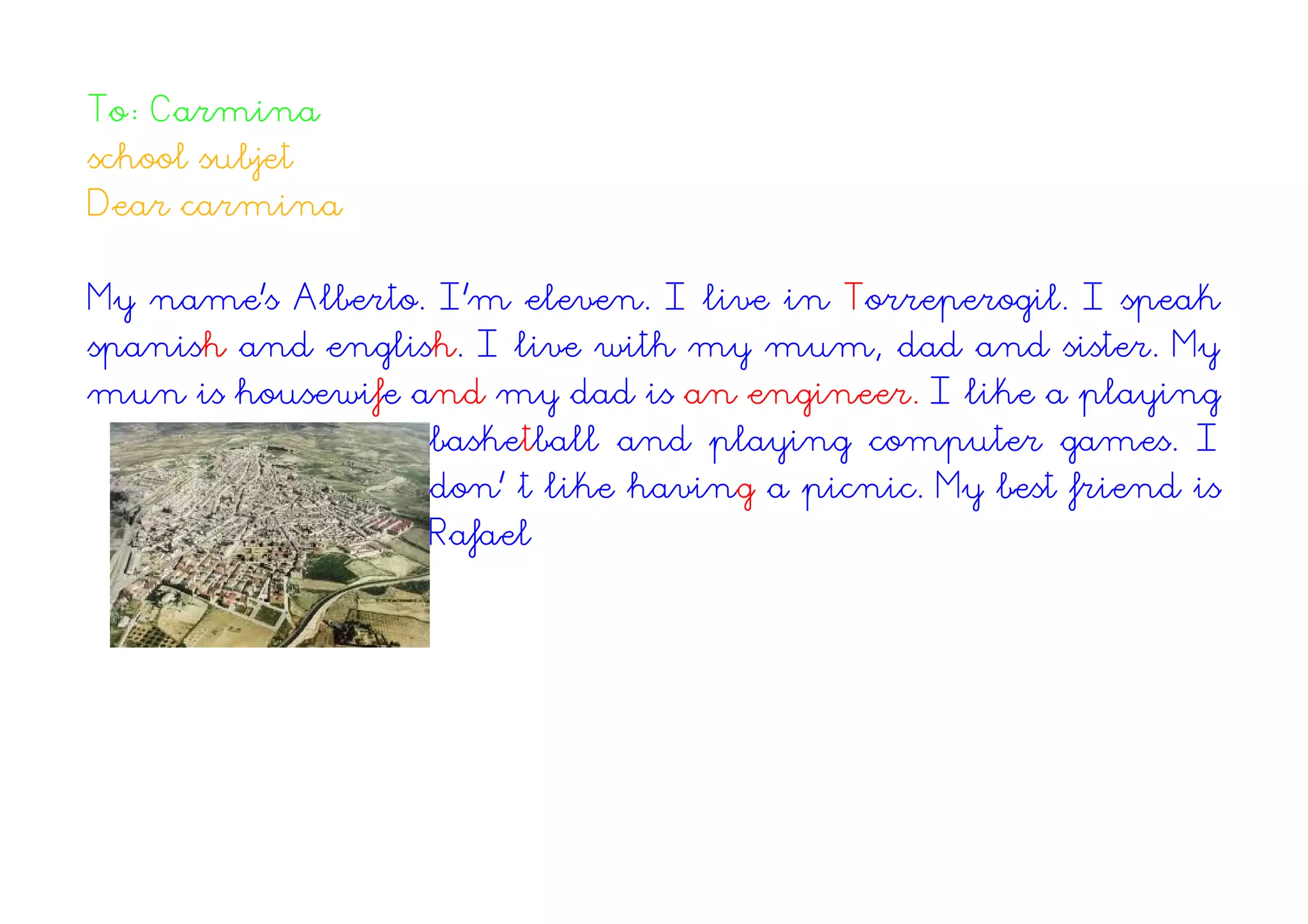 This document contains letters from several students in Torreperogil, Spain introducing themselves for a school exchange program. They provide their name, age, where they live, languages spoken, who they live with and what their parents' jobs are. They also share their hobbies and dislikes, and name their best friends. The letters are signed off with their name at the end.