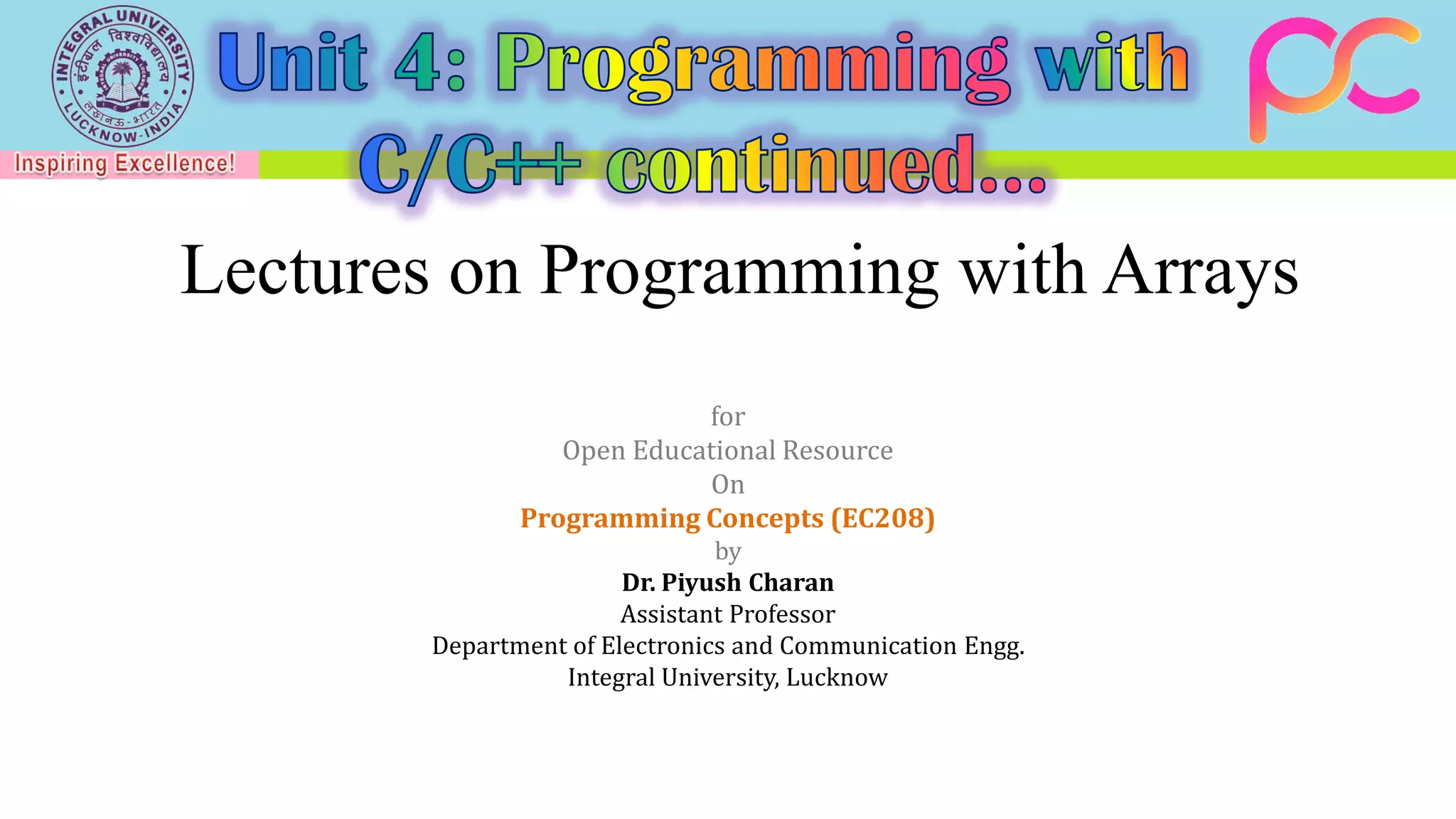 This document contains lecture slides from Dr. Piyush Charan on programming with arrays. It includes introductions to arrays and examples of simple programs using arrays, such as accepting user input of numbers into an array and displaying them. It also contains an example of bubble sort algorithm to sort arrays in ascending order and a program to calculate the sum of two arrays. The document serves as an open educational resource on programming concepts related to arrays.