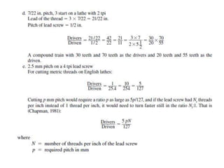 The document covers various methods of thread manufacturing including casting, molding, thread rolling, and cutting on lathes and drilling machines. It explains the advantages and limitations of each method, detailing tools and techniques involved in the processes, as well as the operational procedures for creating different types of threads. Additionally, it specifies the mechanisms for die threading and the types of dies used in industrial applications.