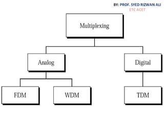 This document discusses multiplexing and spreading techniques for bandwidth utilization and privacy/anti-jamming. It covers frequency division multiplexing (FDM), wavelength division multiplexing (WDM), time division multiplexing (TDM), statistical TDM, inverse multiplexing, frequency hopping spread spectrum (FHSS), and direct sequence spread spectrum (DSSS). Examples are provided for combining voice channels using FDM, optical signal multiplexing with WDM, and modulating data streams for transmission using TDM, FHSS, and DSSS. Common applications discussed include radio/TV broadcasting, fiber optic networks, telephone systems, and digital subscriber lines.