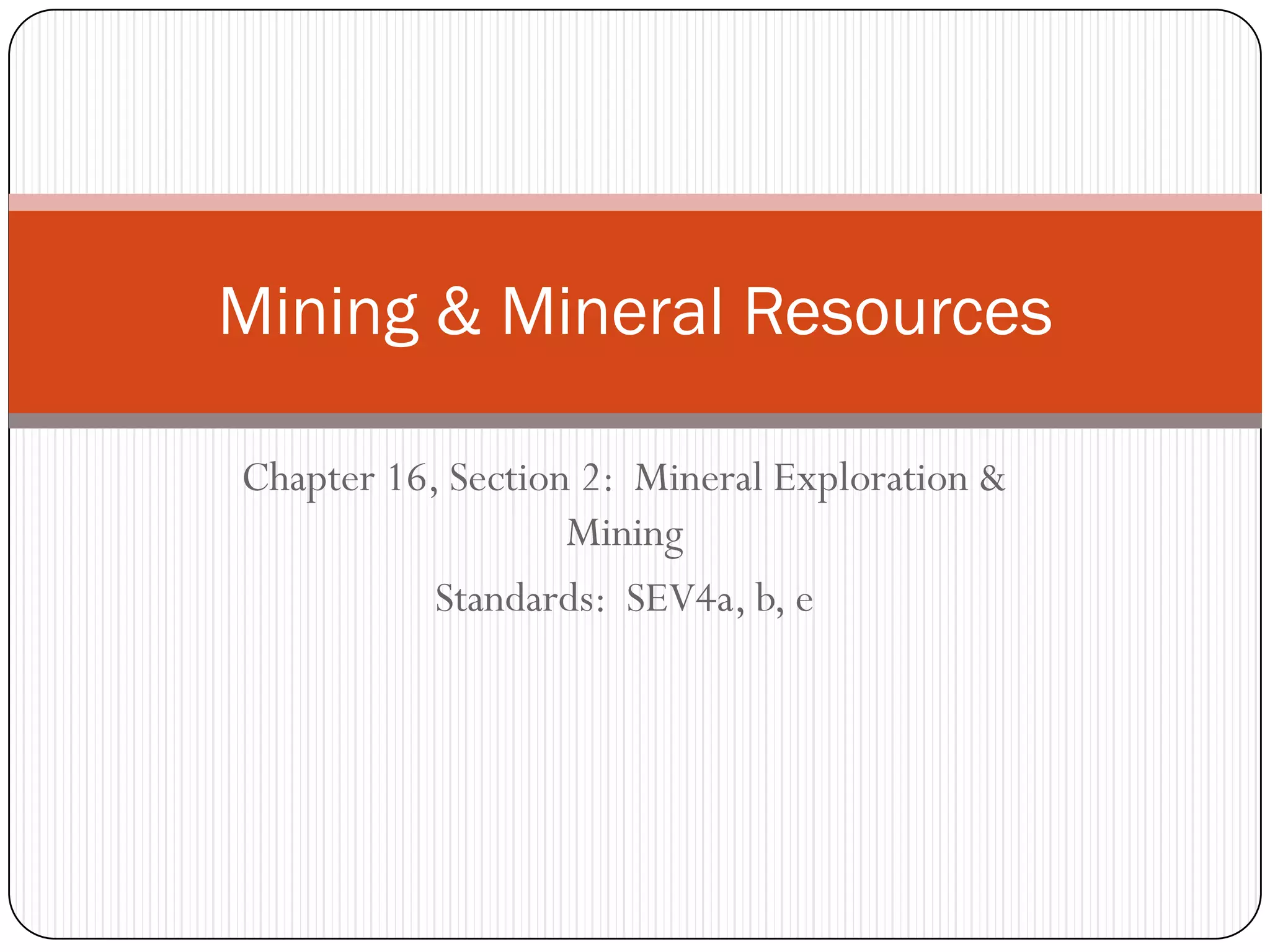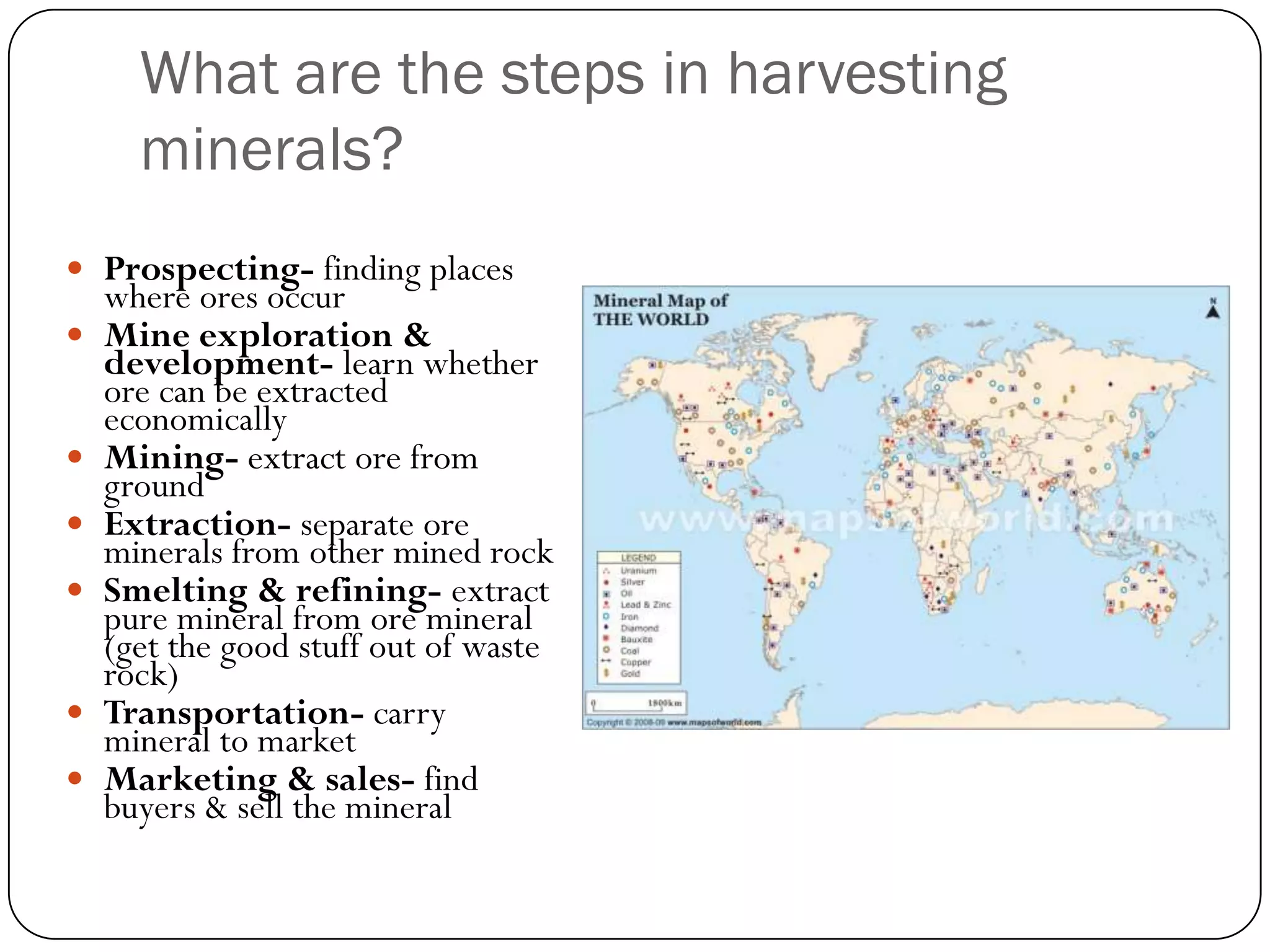 The document describes the process of mineral exploration and mining. There are several key steps: (1) prospecting to find mineral deposits, (2) exploration to determine if extraction is economically viable, (3) mining to extract the ore, (4) extraction to separate the minerals from waste rock, and (5) smelting and refining to purify the extracted minerals. Mining occurs either through subsurface techniques like room and pillar mining or longwall mining, or surface techniques including open pit mining and quarrying. The document also discusses how minerals are located and tested before mining begins.
