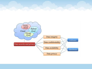 The document discusses various aspects of cloud computing and security, covering risks, security advantages and disadvantages, and data management strategies. It emphasizes the significance of data confidentiality, integrity, and availability, alongside outlining tools and technologies like Hadoop and VMware. The text also explores the evolution of content level security and the importance of disaster recovery plans in cloud environments.
