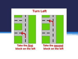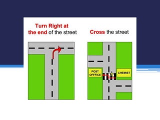 This document provides phrases for asking for directions and responding to requests for directions. It includes phrases like "How do I get to...", "Where is...", and "Can you tell me how to get to..." for asking directions. For providing directions, it lists terms like "go straight ahead", "turn left/right", "go down/up", and indicates landmarks like "it's on your left/right". Sample dialogs demonstrate asking for and providing directions to a bank and restrooms.