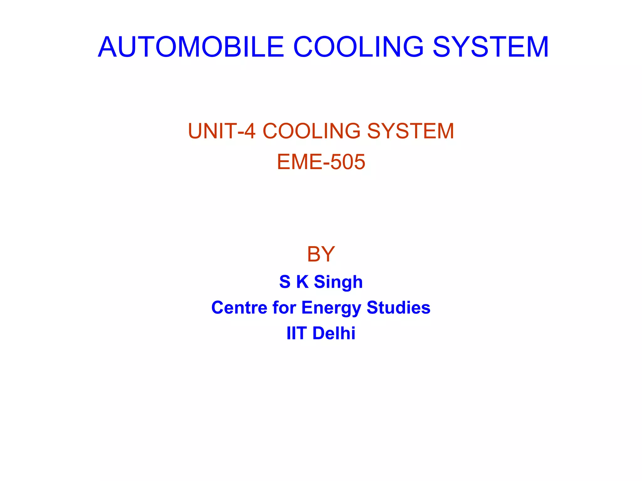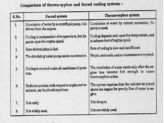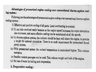 The document discusses the automobile cooling system. It notes that the cooling system serves to maintain the engine at an optimum operating temperature to prevent damage. It then describes the two main types of cooling systems - air cooling and liquid cooling. The liquid cooling system uses coolant to circulate through the engine and transfer heat to a radiator for dissipation. Key components of the liquid cooling system are then outlined, including the water jacket, water pump, radiator, thermostat, hoses, and pressure cap.