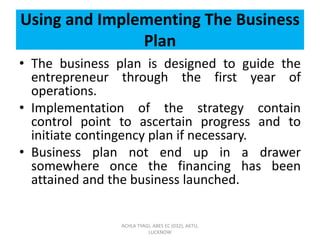 The document discusses implementing and using a business plan after financing has been obtained. It emphasizes that the business plan should guide operations for the first year and be updated if conditions change. Key aspects that should be monitored include profit/loss, cash flow, inventory, production, quality, sales, accounts receivable, and disbursements. Reasons for business plan failure include setting unreasonable goals, lacking measurable goals, insufficient commitment, inexperience in the business, failure to identify threats, and not establishing customer need.