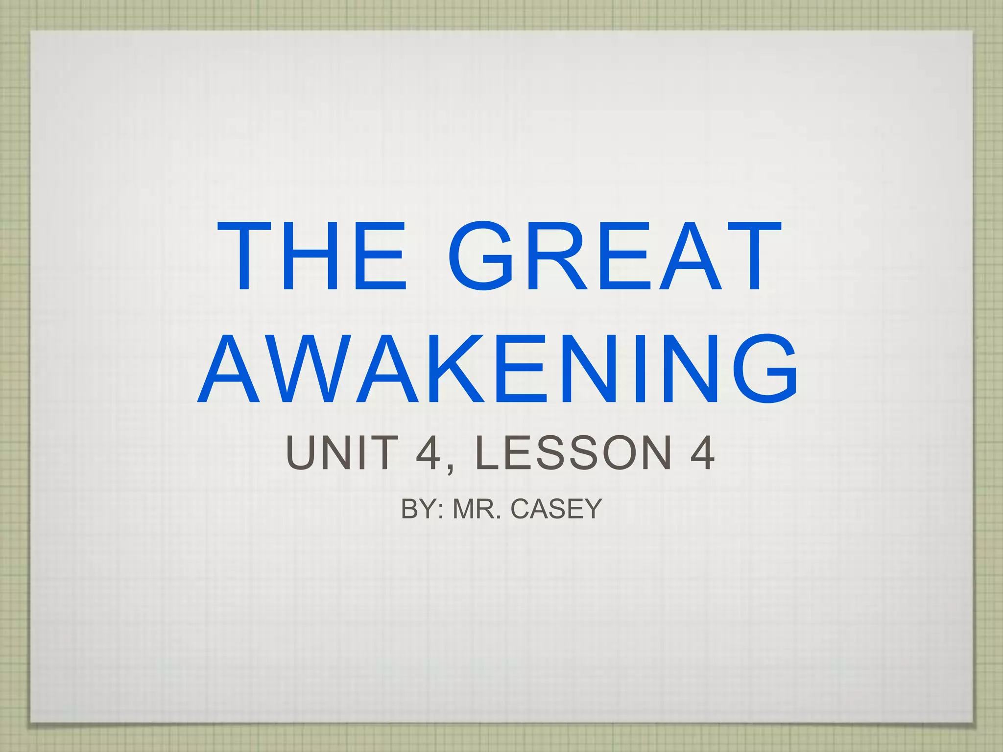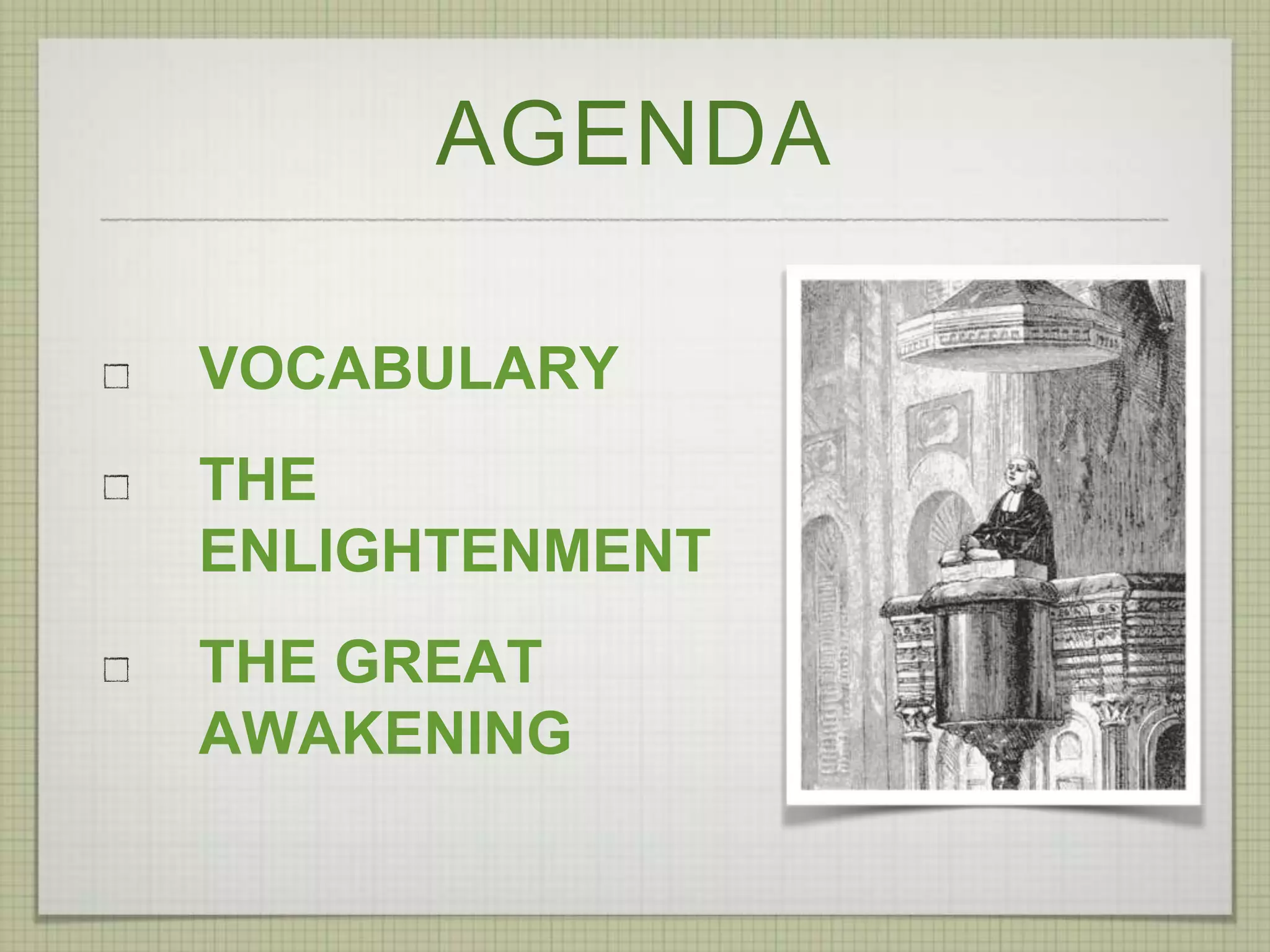 The document discusses the Enlightenment and the Great Awakening. The Enlightenment occurred in the late 17th to early 18th centuries and emphasized human reason and science over religious faith. It encouraged questioning established authority like the church. The Great Awakening was a religious revival in American Protestantism that aimed to refocus people on religion and make it more emotional. Leaders like Jonathan Edwards and George Whitefield preached to engage people's hearts and minds. The Great Awakening increased religious interest, questioning of authority, and the founding of new denominations like Methodists and Baptists.