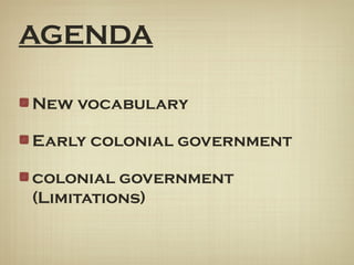Democratic ideas in colonial America began to emerge as colonists established their own local governments that allowed for limited self-representation. These early governments, such as the House of Burgesses and Mayflower Compact, gave colonists the ability to make decisions on local issues but ultimate authority still rested with the King of England. Over time, the lack of full representation and powers of these colonial governments, such as laws being passed without colonial consent, led to growing tensions that later contributed to America's democratic ideals.