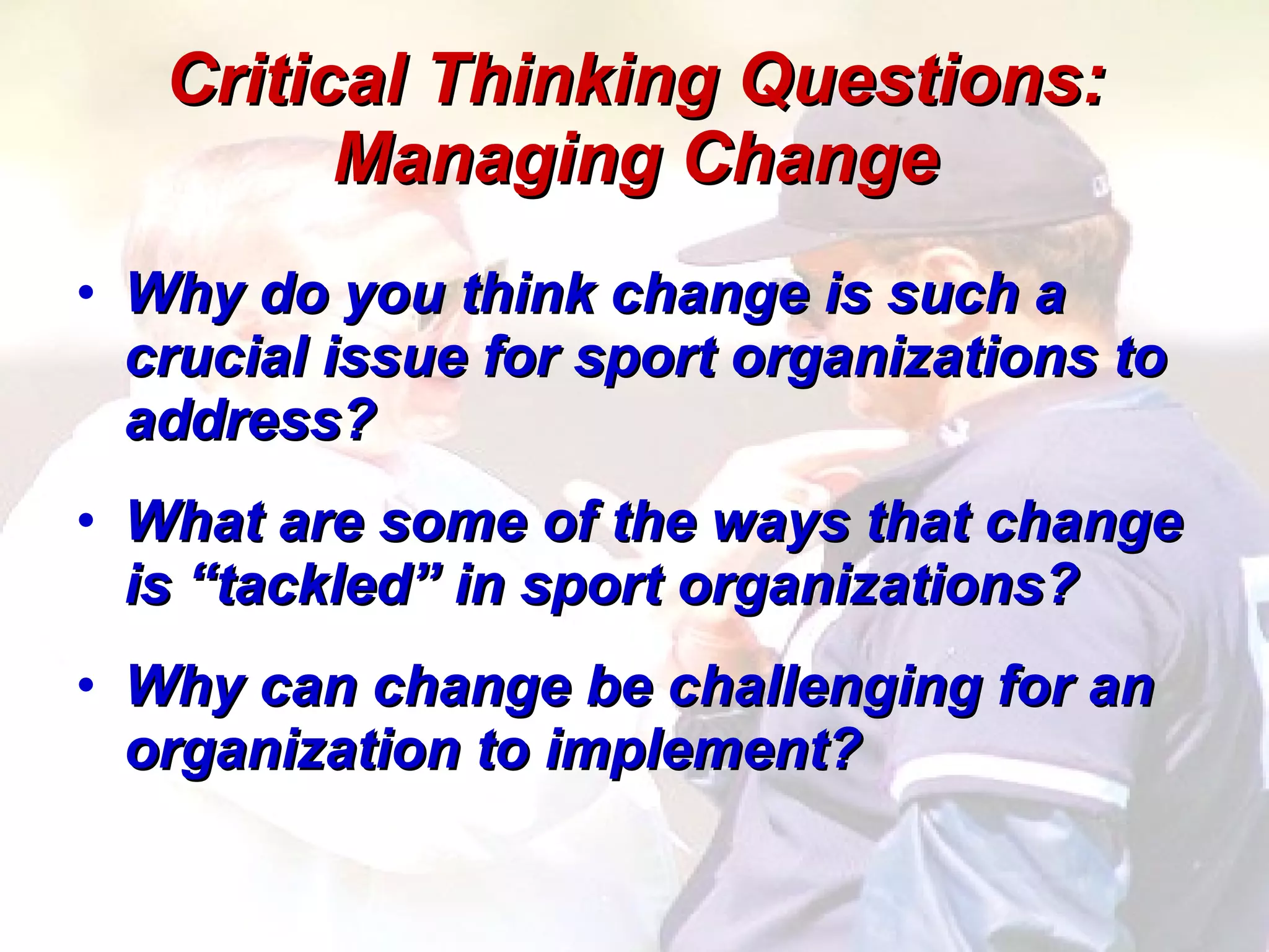 The document discusses managing change in sports organizations. It addresses why change is crucial and how it is implemented in the sports industry. Some of the forces driving change are environmental, economic, social, technological, and demographic shifts. Managing change effectively requires addressing strategies, structure, technology, and people. Overcoming resistance to change involves creating trust, developing clear plans, involving people, and providing support through the change process. Organizational culture and a focus on continuous learning and improvement are also important for managing change.