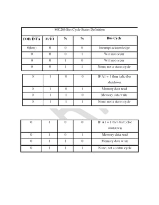 This document discusses the 8086 system bus structure. It begins by describing the basic configurations of minimum and maximum mode 8086 systems, including the system bus timing diagrams for read and write operations. It then discusses multiprocessor configurations using the 8086, including coprocessor configurations with the 8087 and closely/loosely coupled multiprocessor configurations. The document provides detailed information on the 8086 pin descriptions and signals in both minimum and maximum mode.
