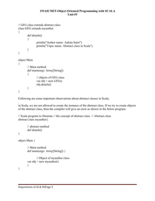 The document discusses abstraction and encapsulation in Scala. It defines abstraction as hiding internal details and showing only functionality. Abstraction in Scala can be achieved using abstract classes, which can contain both abstract and non-abstract methods. Encapsulation in Scala involves using access modifiers like private to restrict access to properties and methods, and packages to organize code. Traits are also discussed as a way to achieve abstraction and multiple inheritance in Scala.