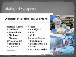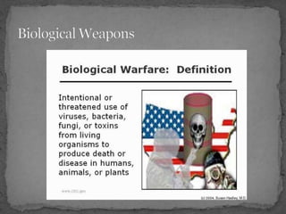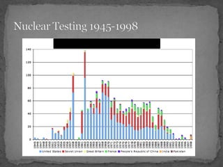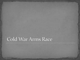 The document summarizes the key events of the Cold War nuclear arms race between the United States and Soviet Union. It began after WWII when the US created the first atomic bomb and used it against Japan. The Soviets tested their first bomb in 1949, starting a nuclear arms competition. Both countries developed more powerful hydrogen bombs and delivery systems like ICBMs throughout the 1950s and 60s. Arms control treaties in the late Cold War aimed to limit nuclear stockpiles and curb proliferation.