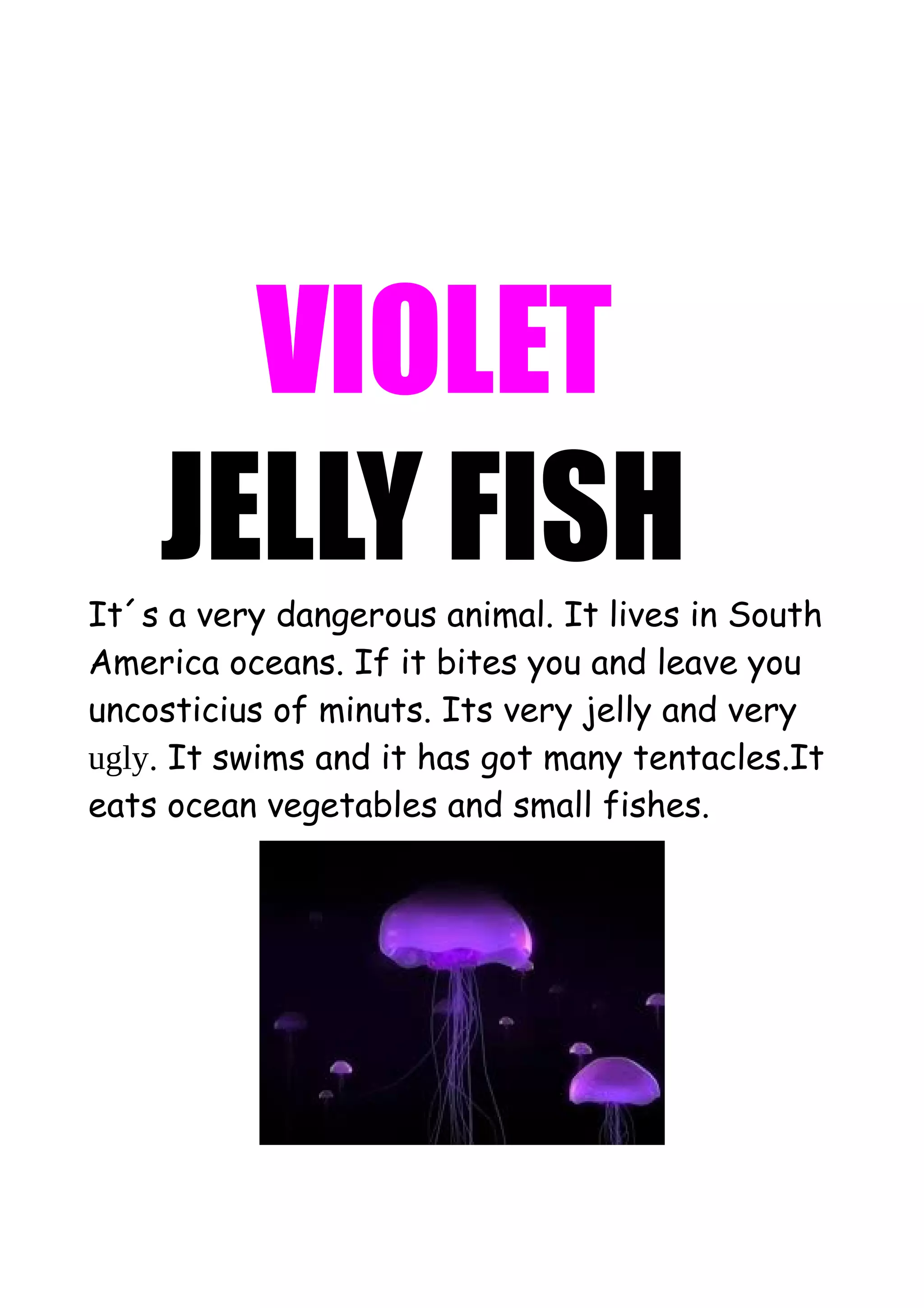 The document contains short descriptions of various animals. It describes the jellyfish as living in South American oceans and having tentacles, the kiwi as a rare, fast-running bird from New Zealand without the ability to fly, and the panda as a small, black and white bear that lives in China and eats bamboo. It also describes the tree frog as having big eyes and a green body, living in Central and South America, climbing trees and eating insects and other frogs.
