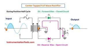The document discusses different types of rectifiers. It describes half-wave rectifiers, full-wave center-tapped rectifiers, and full-wave bridge rectifiers. For each type, it provides the circuit diagram, explains how it works during each half-cycle of the AC input, and lists the advantages and disadvantages as well as common applications.
