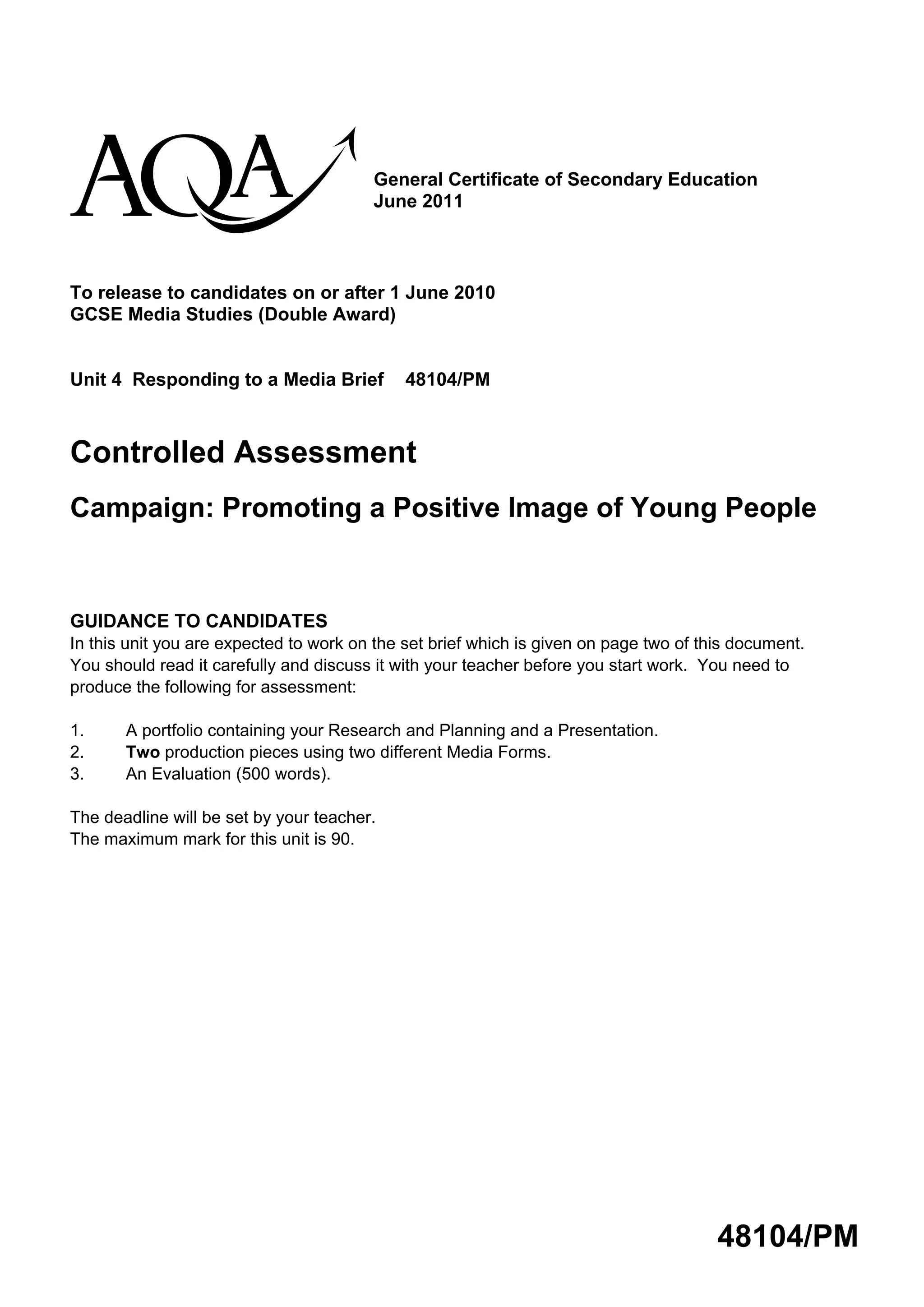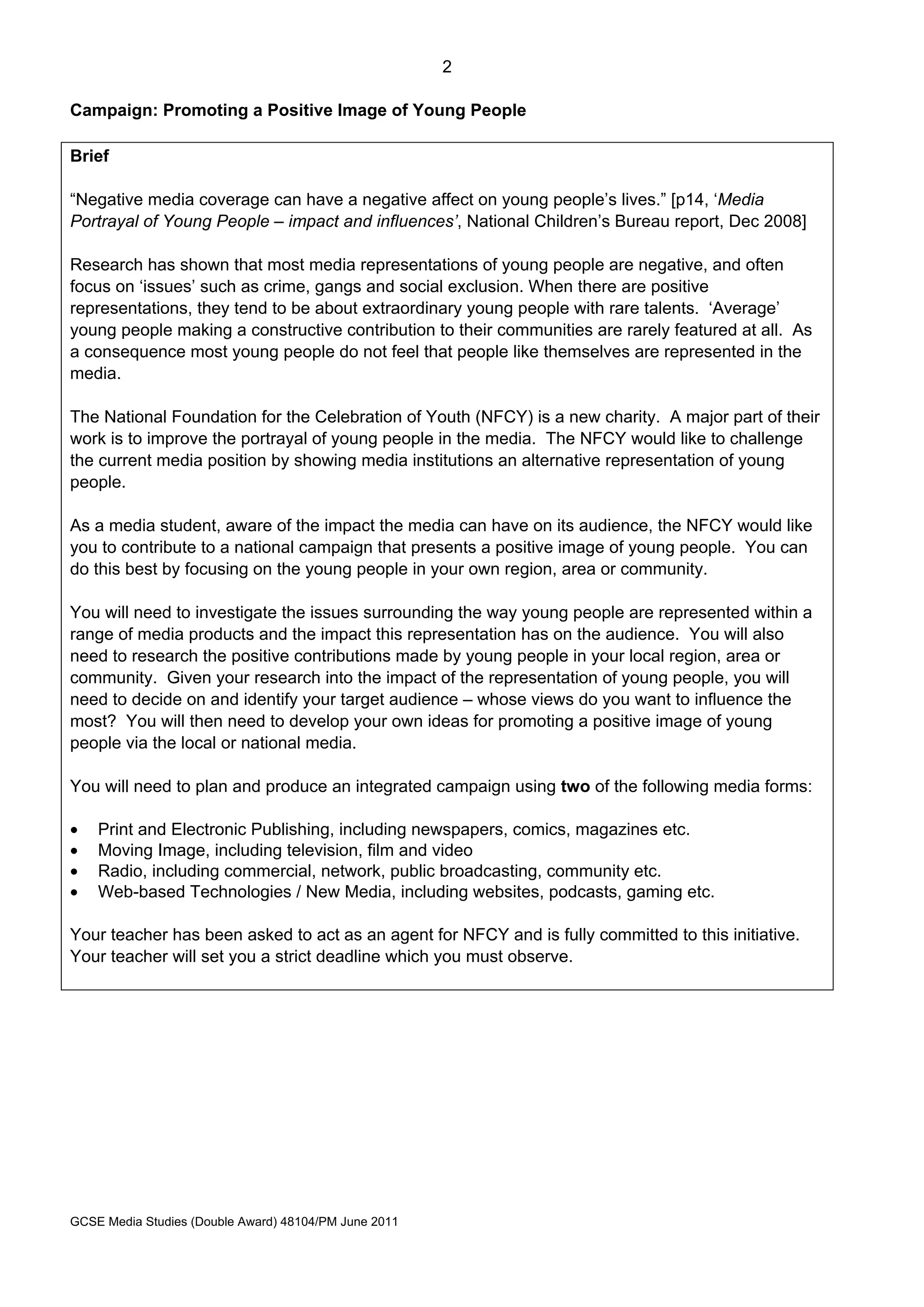 This document provides guidance to students on a controlled assessment task for a GCSE Media Studies course. Students are asked to create an integrated media campaign promoting a positive image of young people. They must conduct research, develop ideas for two media products, present their ideas, and produce the two media products along with an evaluation. They will be assessed on their research, planning, presentation, production, and evaluation skills. The document outlines the requirements, assessment criteria, timeline, and guidance on approaching the task.