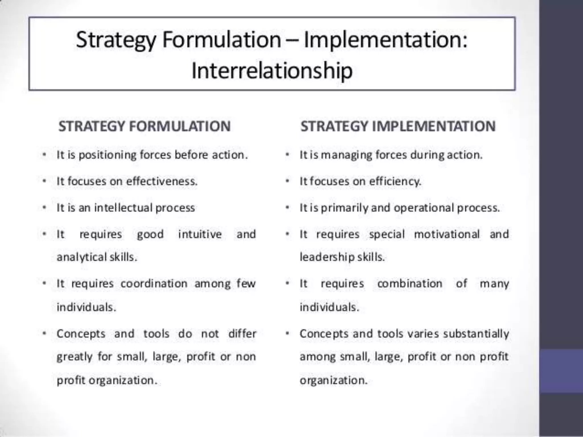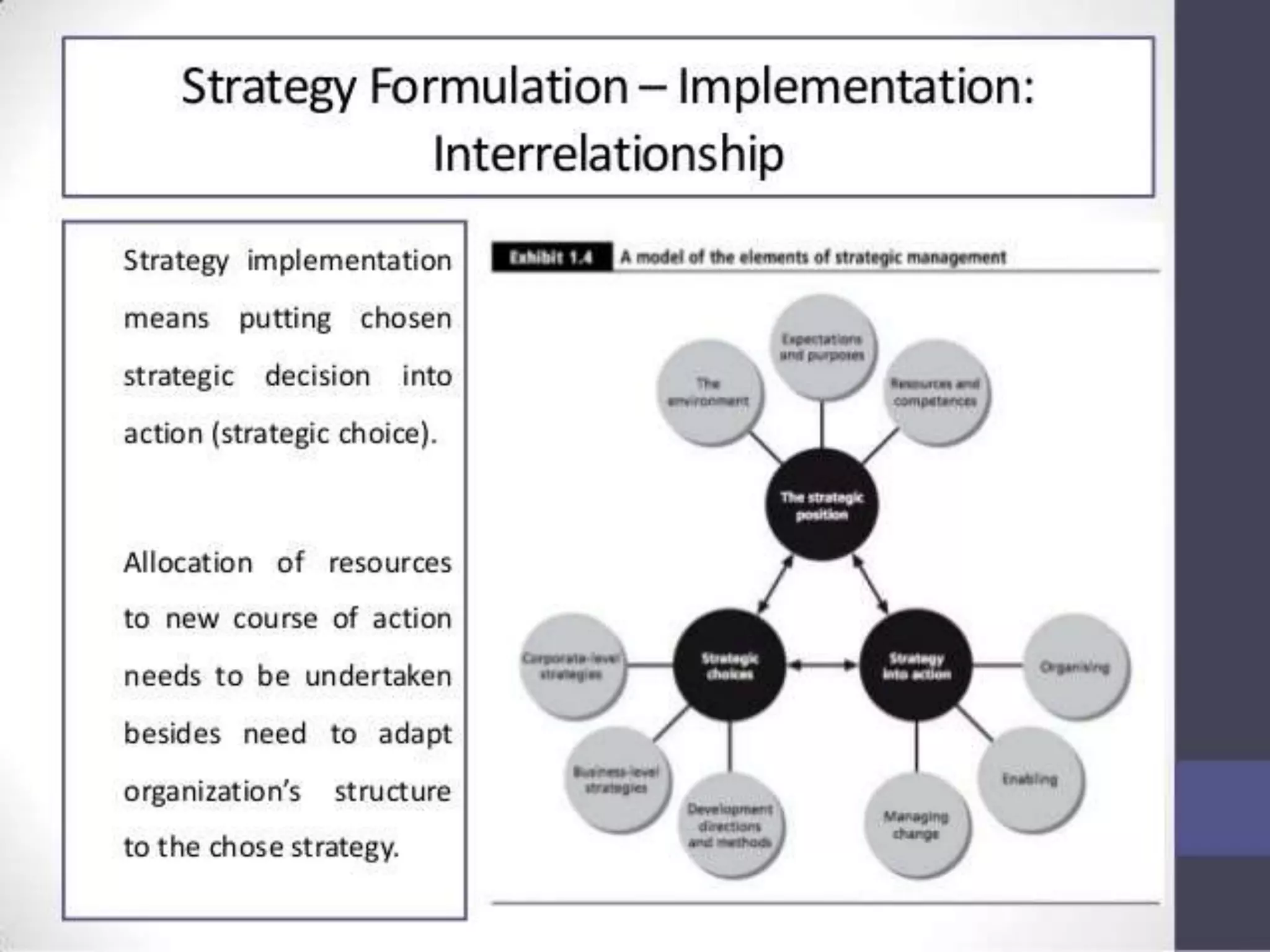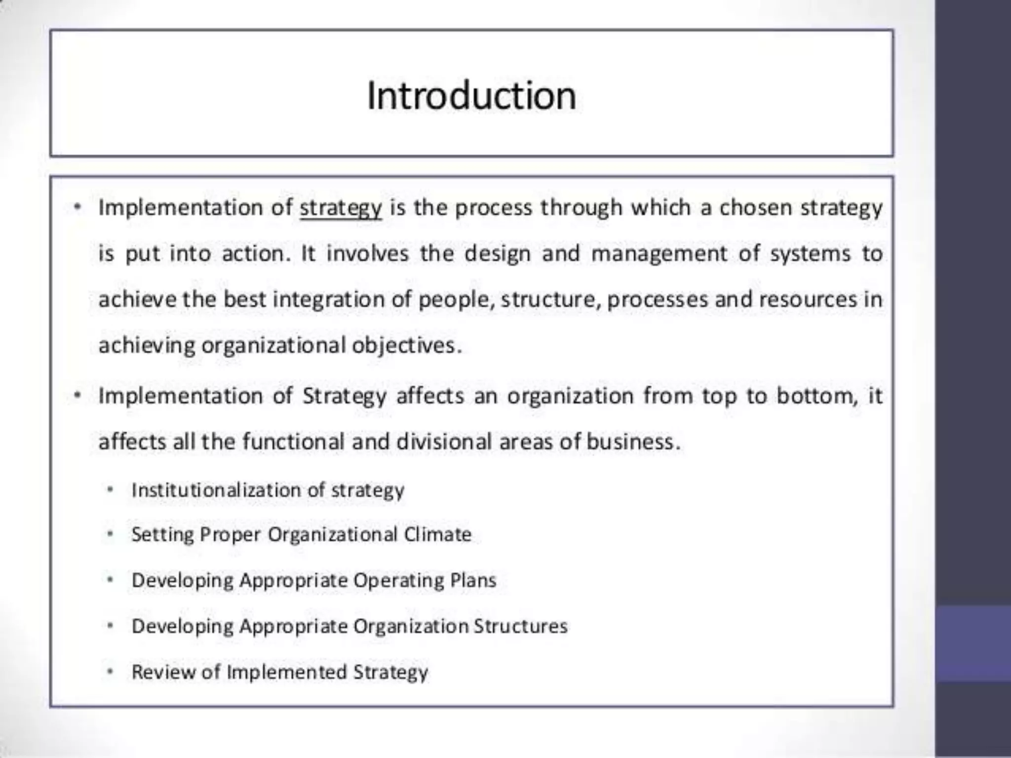 - The meaning and elements of strategy implementation such as differentiation, integration, structure, decision processes, and rewards systems.