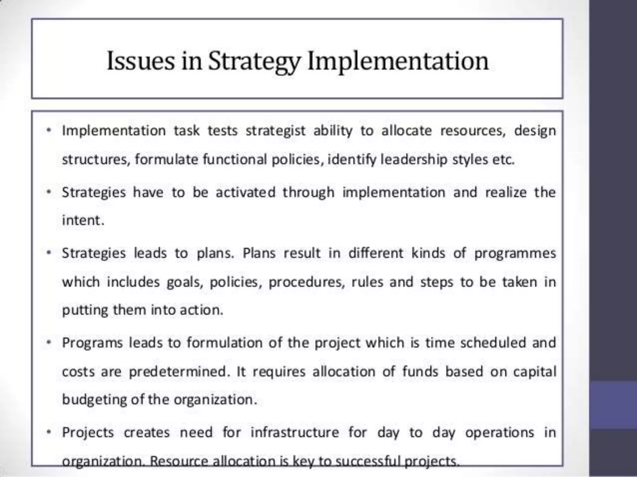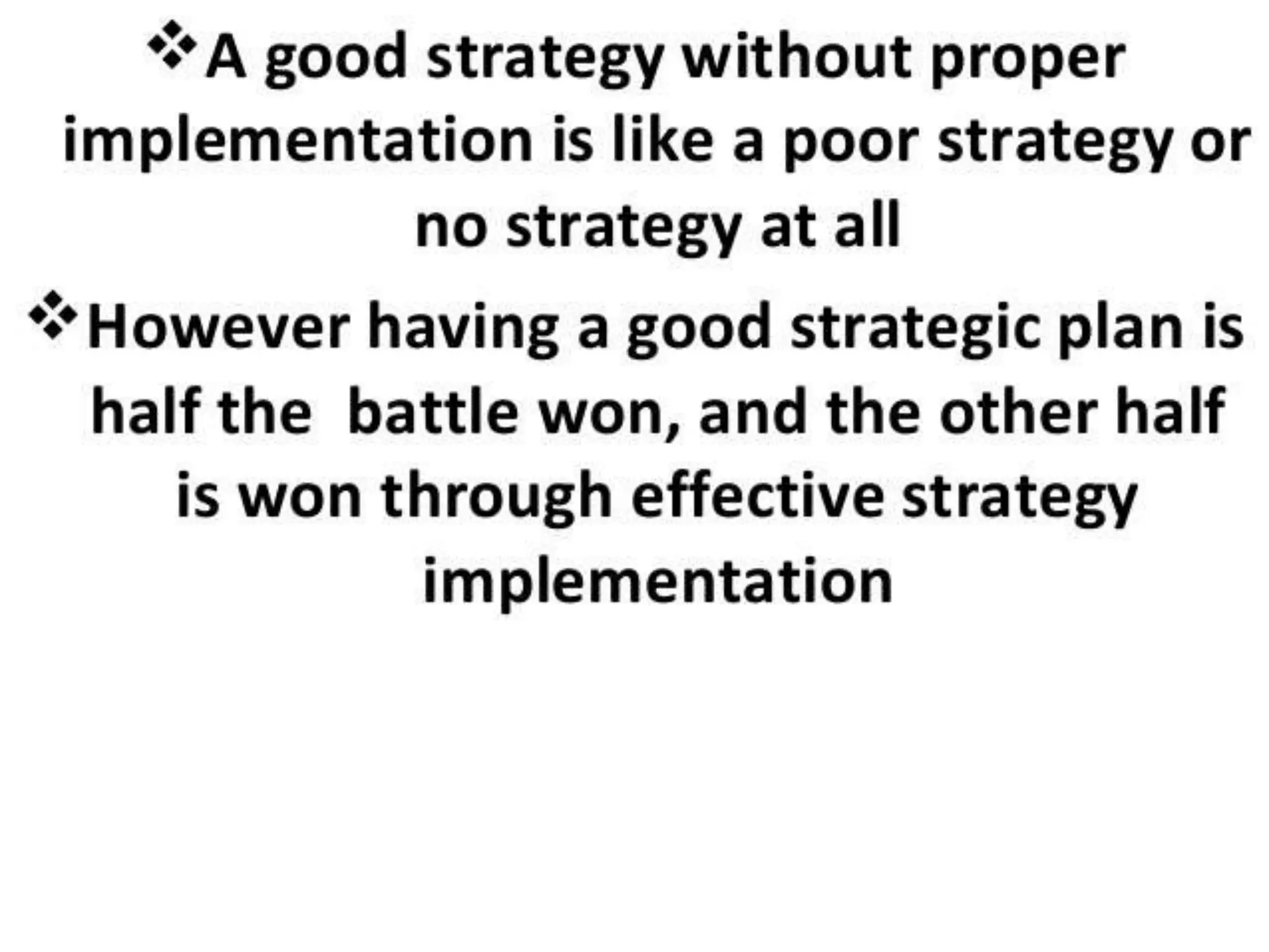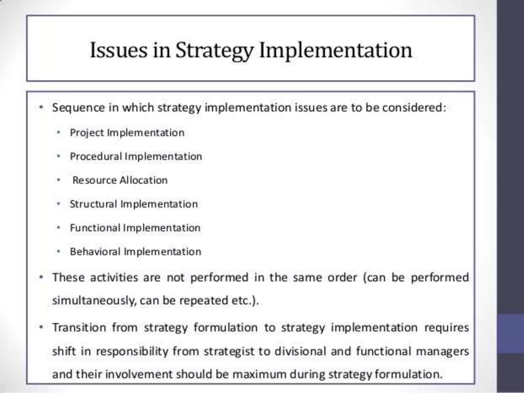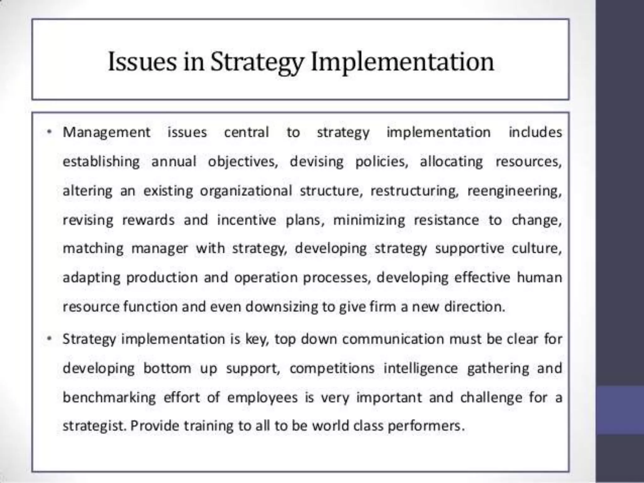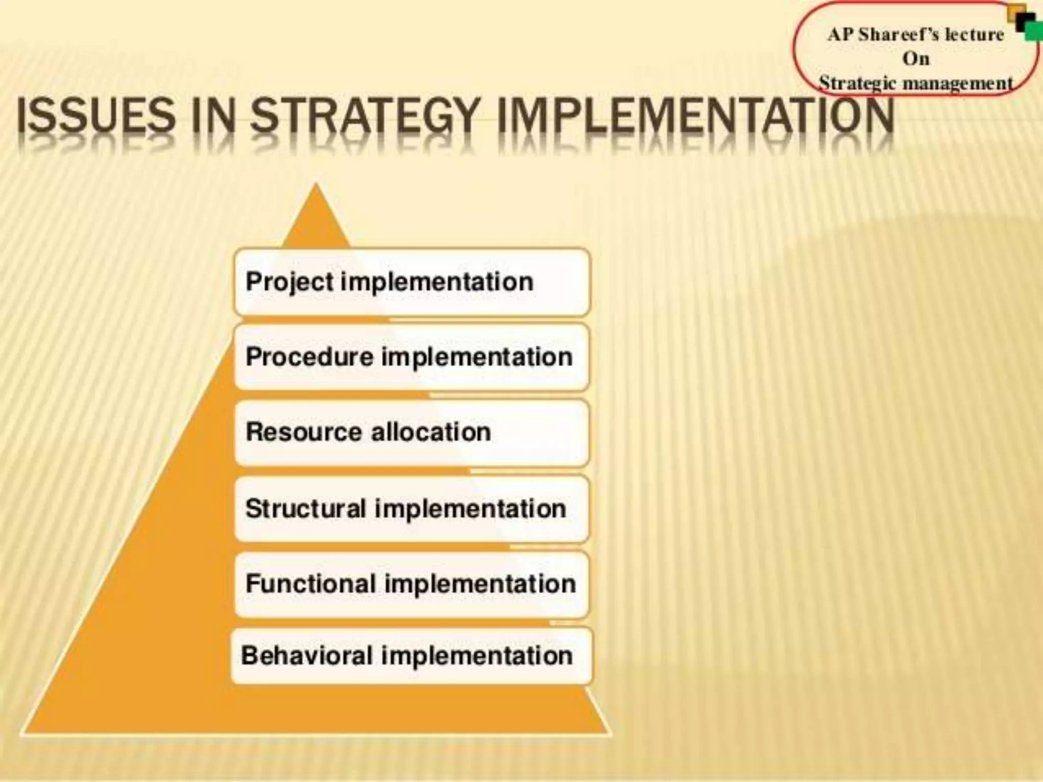 This document discusses various aspects of strategy implementation including: