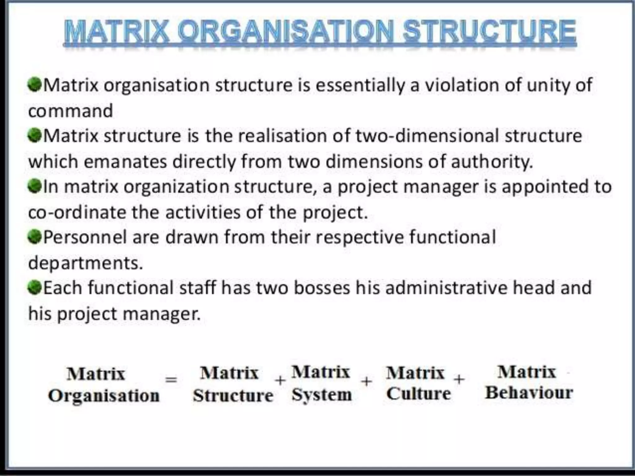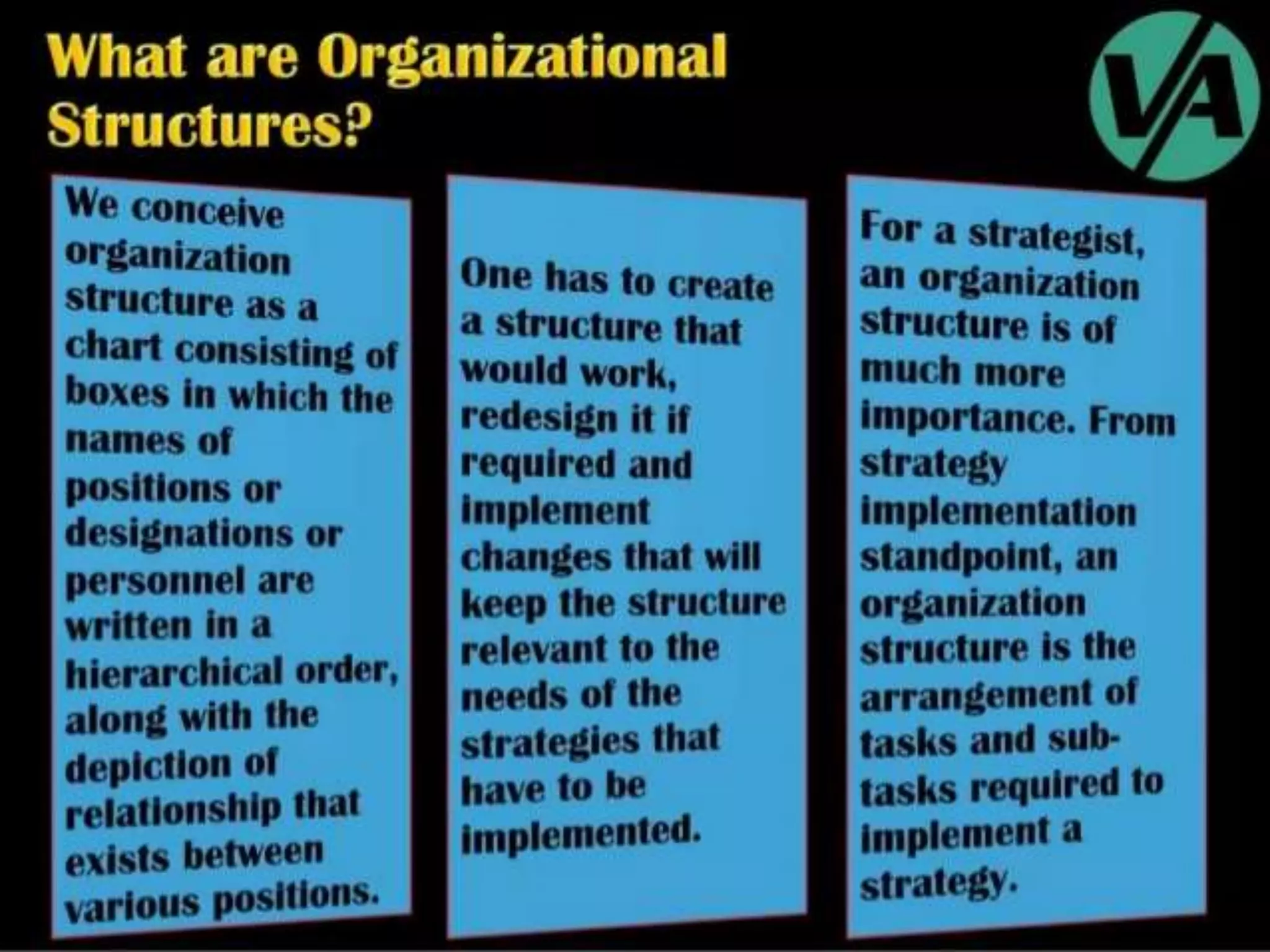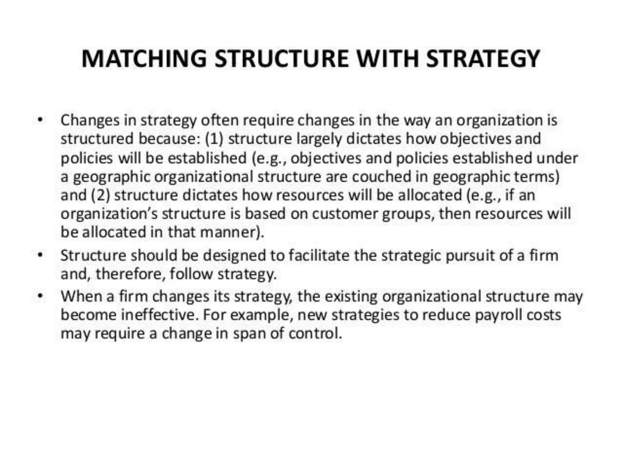 - Types of organizational structures like functional, divisional, and matrix and how they should be matched to strategies.