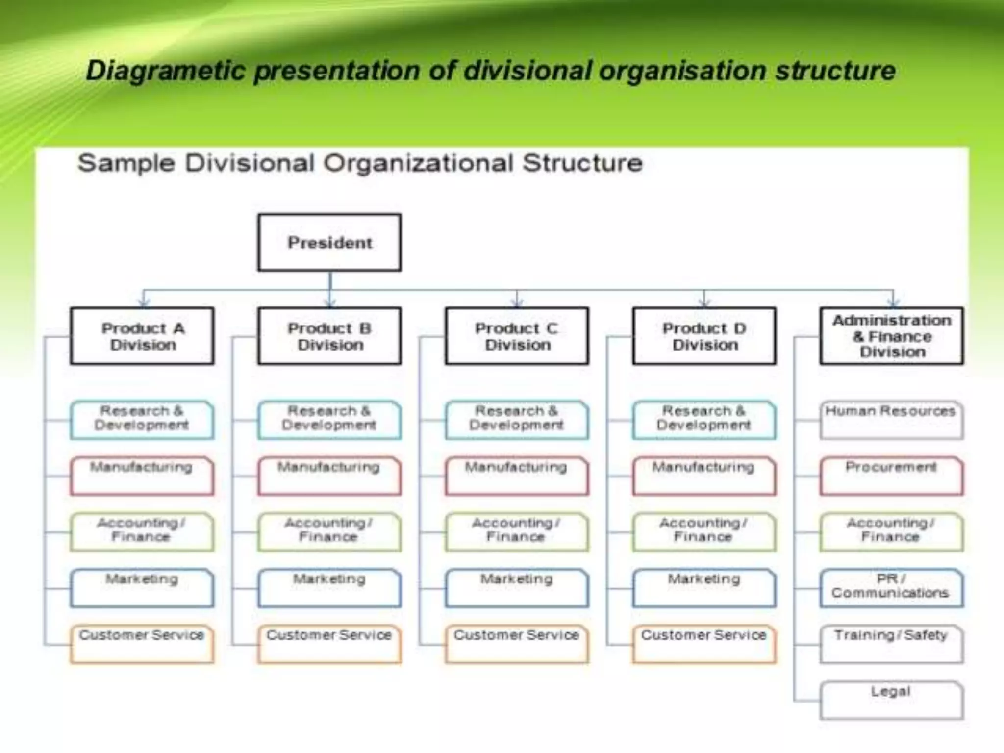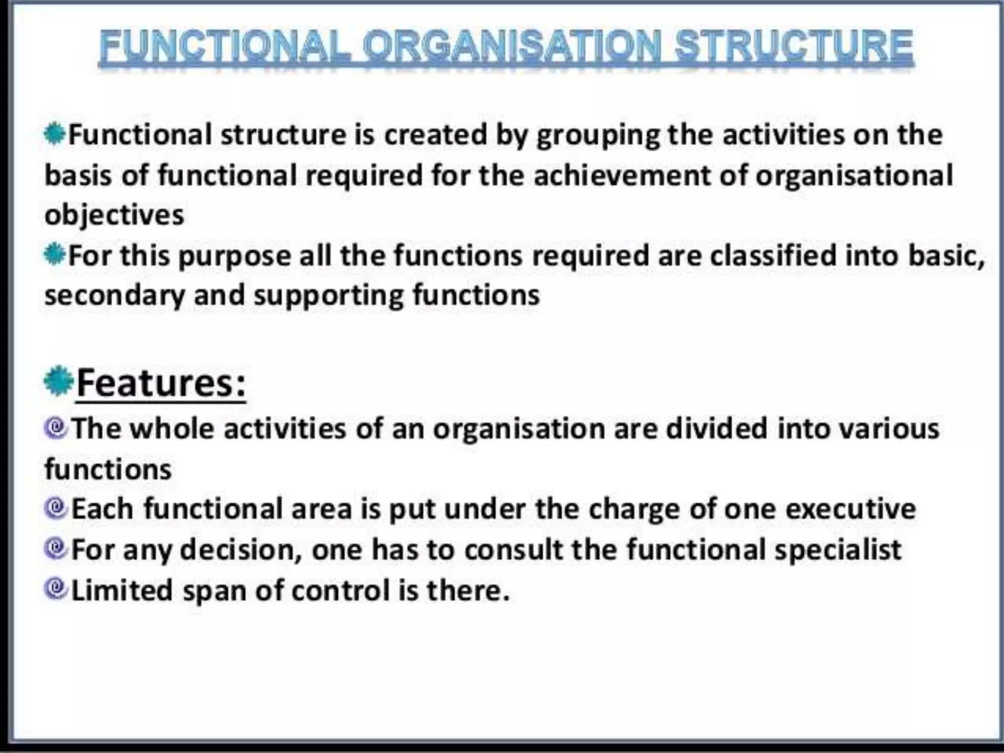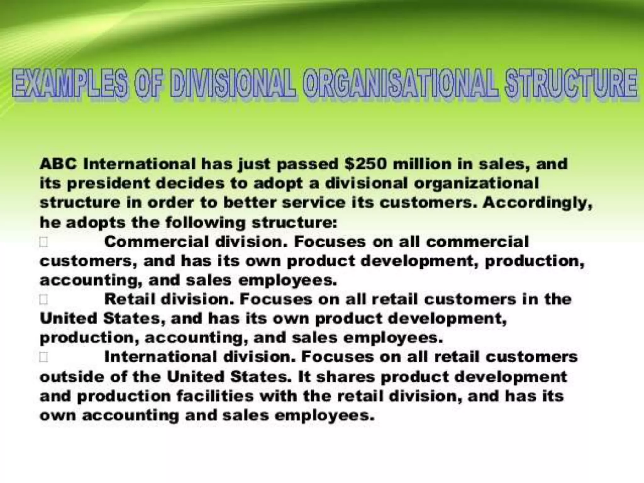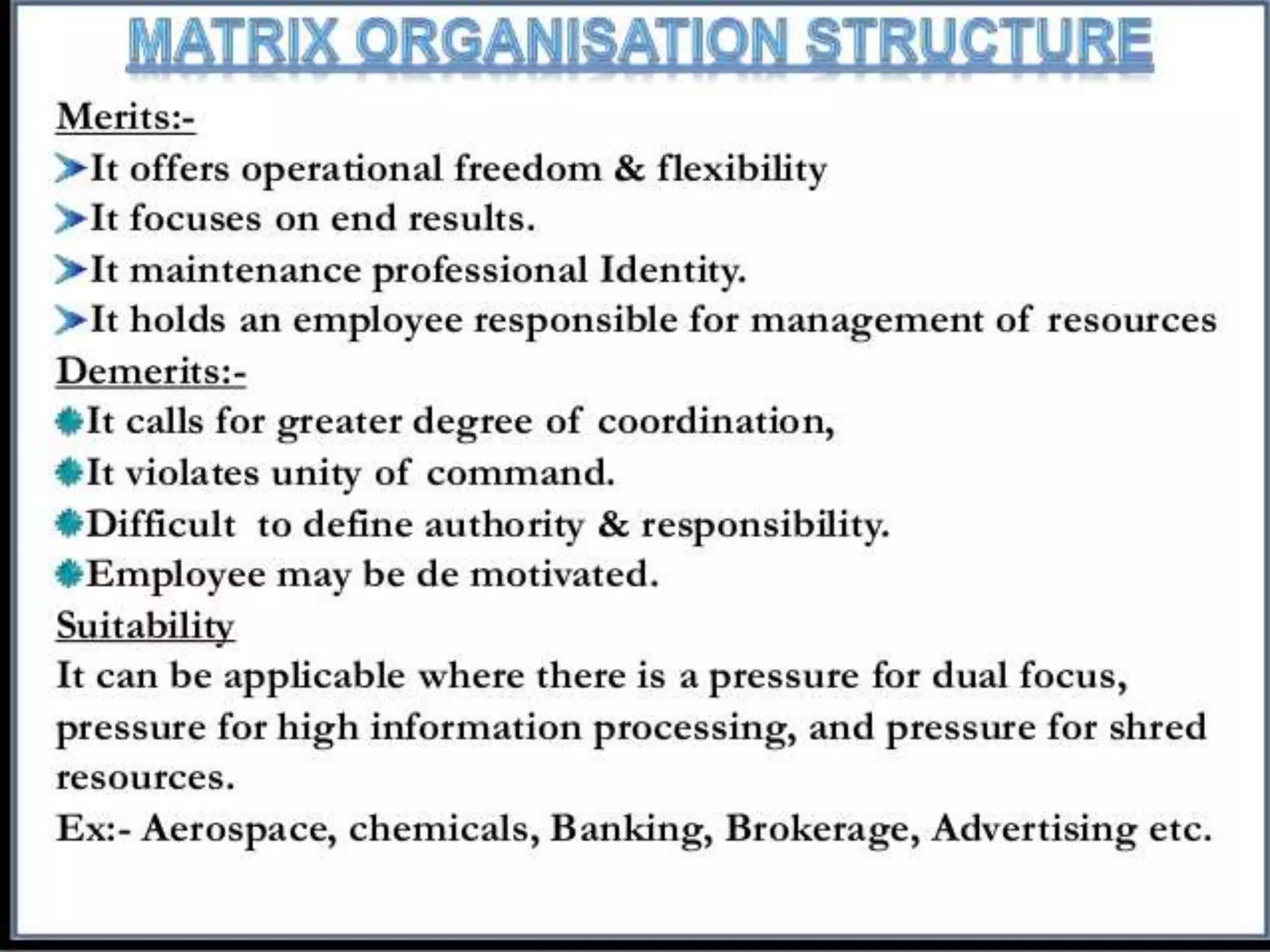 - Types of organizational structures like functional, divisional, and matrix and how they should be matched to strategies.