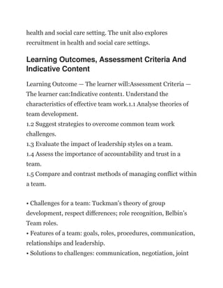 Learning Outcome — The learner will:Assessment Criteria — The learner can:Indicative content1. Understand the characteristics of effective team work.1.1 Analyse theories of team development.