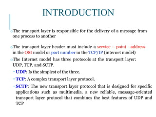 The transport layer is responsible for process-to-process delivery using protocols such as UDP, TCP, and SCTP, each serving different needs. UDP is a connectionless and unreliable protocol useful for applications that require fast data transmission, while TCP offers connection-oriented service with reliable and orderly data transfer. These protocols operate using port numbers and IP addresses to deliver messages between application processes across networks.