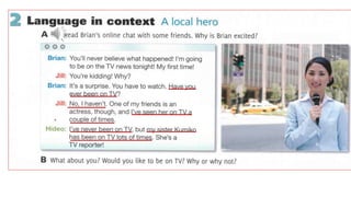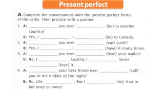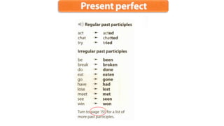 The document provides information about the present perfect tense in English, including its forms, structures, uses, and examples. It discusses three main uses of the present perfect tense: 1) to talk about experiences and events in an unspecified time in the past, 2) to talk about a past action that affects the present, and 3) to talk about an action that started in the past and continues to the present time. It also provides examples of using time expressions like "already," "yet," "since," and "for" with the present perfect tense.