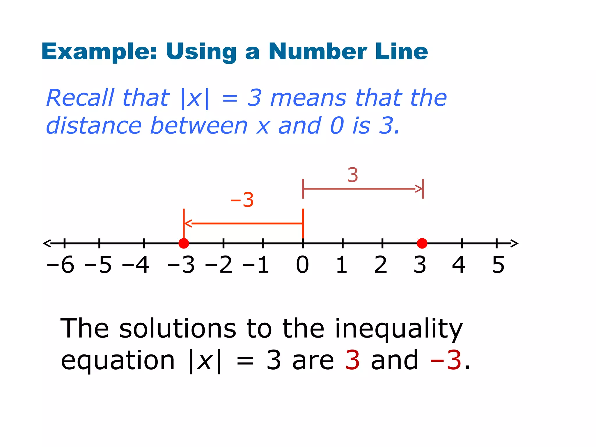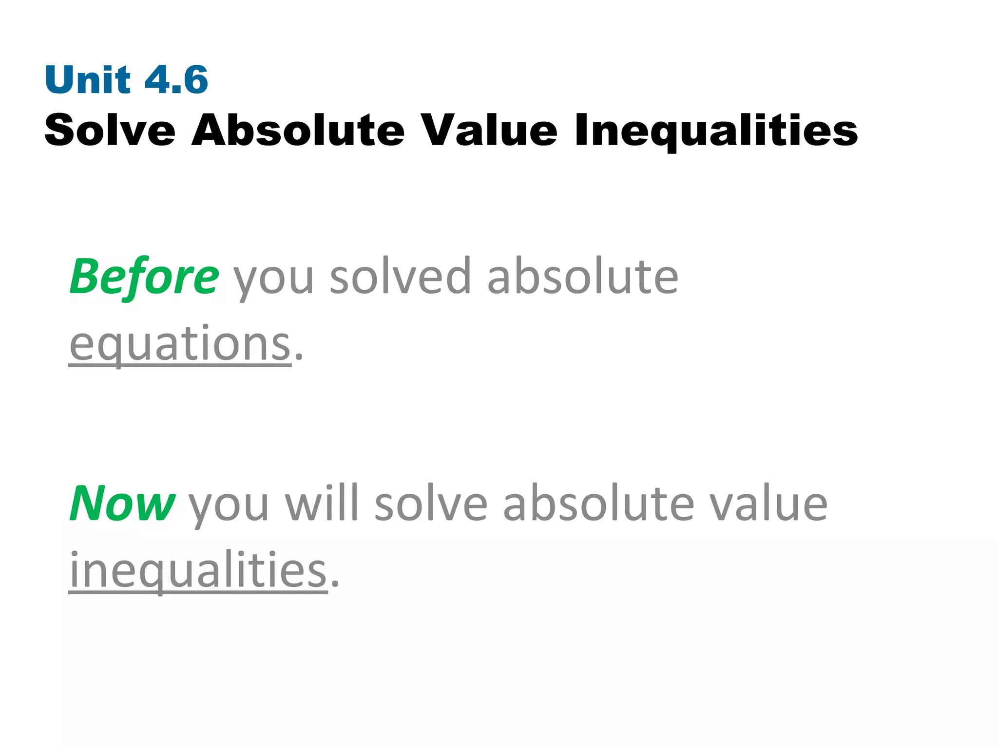 The document discusses how to solve absolute value inequalities by determining if the distance between a variable and 0 is less than, greater than, or equal to a given value, and representing the solutions on a number line. Examples are provided to illustrate solving inequalities such as |x| < 3, |x| > 3, and |x| ≥ 6, explaining that the solutions lie between, beyond, or beyond and equal to certain values. Practice problems are then given for students to solve additional absolute value inequalities and graph the solutions.