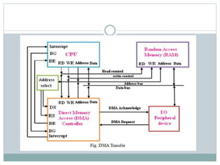 The document discusses input/output (I/O) interfaces in computer systems. It explains that I/O interfaces allow communication between internal system components like the CPU and external I/O devices. It also describes different I/O bus configurations, types of I/O commands, and methods of data transfer between the CPU and I/O devices like programmed I/O, interrupt-initiated I/O, and direct memory access (DMA). DMA allows I/O devices to directly access system memory without involving the CPU, improving performance.