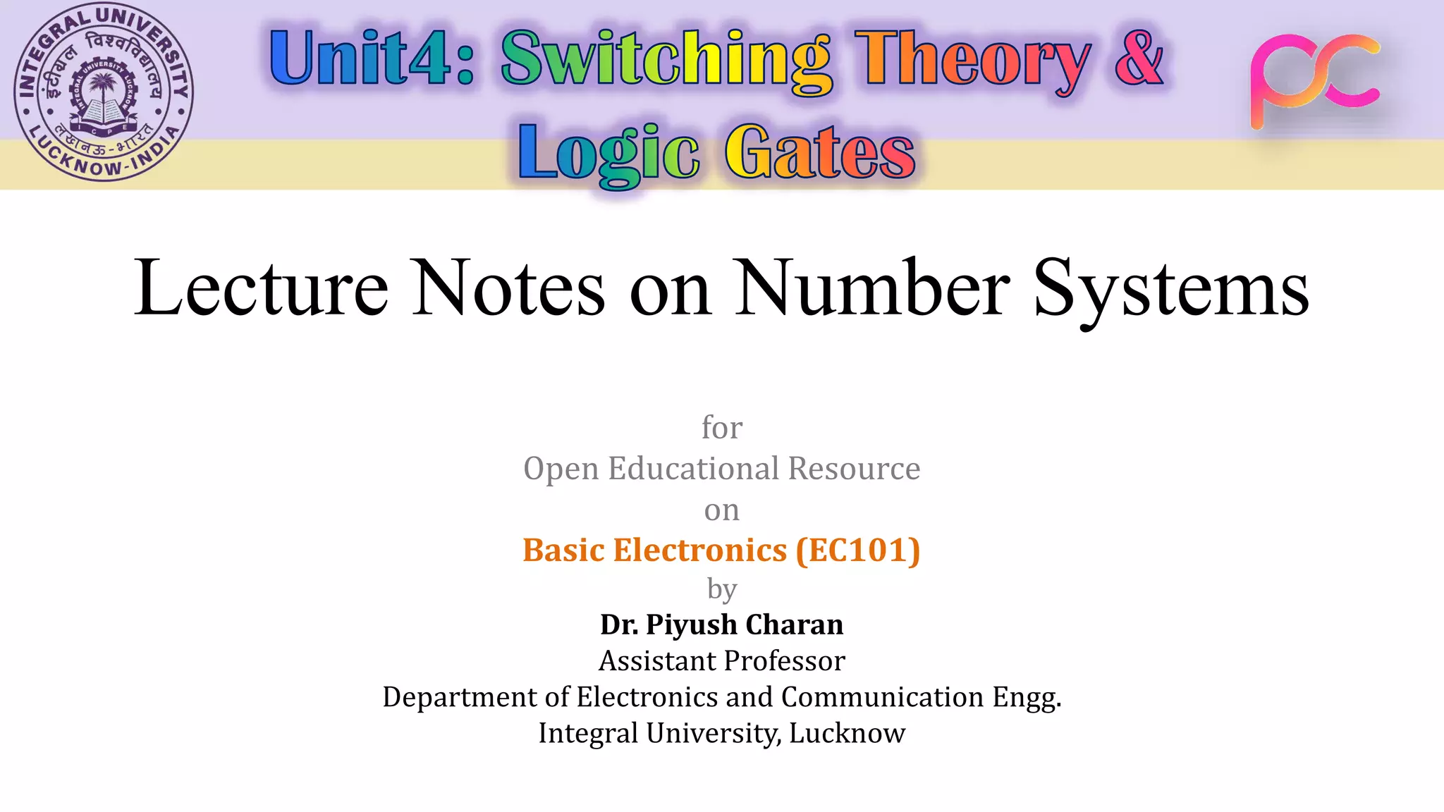 This document contains lecture notes on number systems for an open educational resource on basic electronics. It covers various number systems including binary, octal, decimal, and hexadecimal. Conversion between these number systems is discussed along with 1's and 2's complement representations. Examples are provided to demonstrate converting between number bases and performing addition and subtraction using 1's and 2's complement representations. The document is authored by Dr. Piyush Charan of Integral University for a course on basic electronics.