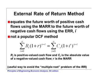 The document discusses various methods for evaluating the economic profitability of projects and investments, including the minimum attractive rate of return (MARR), present worth method, future worth method, annual worth method, internal rate of return method, external rate of return method, and payback period method. It also covers concepts for comparing mutually exclusive alternatives, such as using equivalent worth and rate of return methods, and considerations when useful lives are equal versus unequal among alternatives.