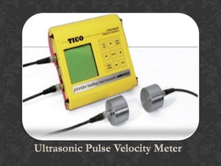 This document discusses non-destructive testing (NDT) methods for evaluating concrete structures. It describes two specific NDT techniques: ultrasonic pulse velocity testing and rebound hammer testing. Ultrasonic pulse velocity testing measures the speed of ultrasonic pulses traveling through concrete to assess quality and detect flaws. The rebound hammer test uses the rebound of an elastic mass to indicate the hardness and estimated compressive strength of concrete surfaces. Both methods can help evaluate concrete without damaging it and provide information on defects, homogeneity, and strength.