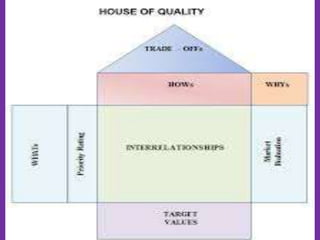 The document outlines various Total Quality Management (TQM) tools and techniques, focusing on Quality Circles, Quality Function Deployment, and the Taguchi Loss Function. Quality Circles are voluntary employee groups aimed at improving work quality through problem-solving teamwork, while Quality Function Deployment (QFD) translates customer needs into actionable design steps, enhancing product development efficiency. The document also discusses the roles, structures, benefits, and limitations of these quality improvement methods within organizations.