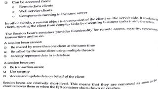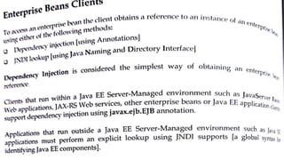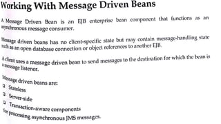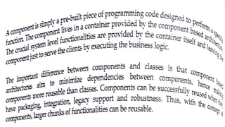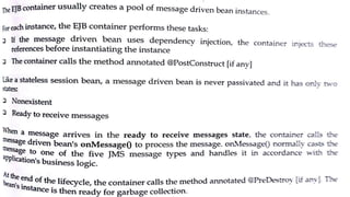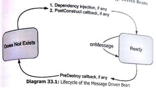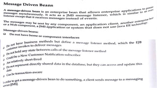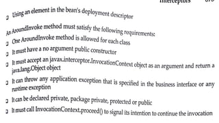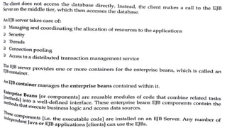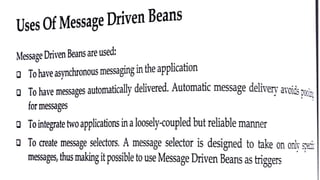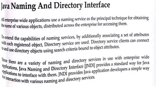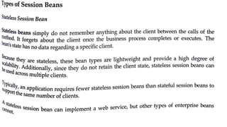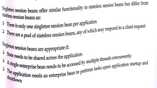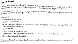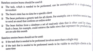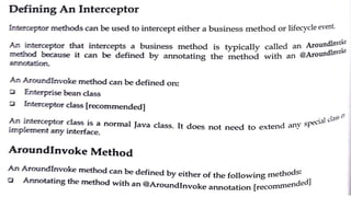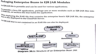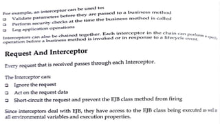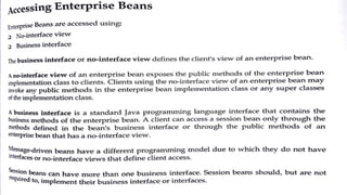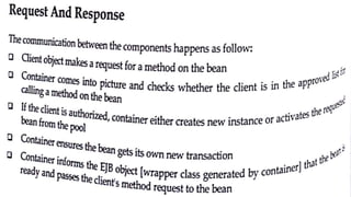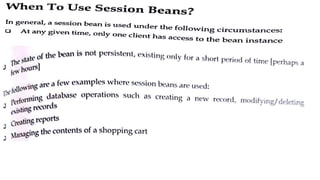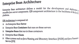 This document provides an overview of enterprise JavaBeans (EJBs), including the different types of EJBs (session beans and message driven beans), interceptors, and the Java Naming and Directory Interface (JNDI). It discusses session beans in more detail, explaining the differences between stateless session beans, stateful session beans, and singleton session beans. It also defines what a naming service and directory service are in the context of Java application development.