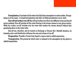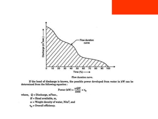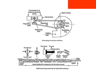 Hydroelectric power plants convert the kinetic energy of flowing water into electrical energy. There are several key components of hydroelectric power plants including a dam to store water in a reservoir, turbines to convert the energy of falling water into rotational energy, and generators to convert that rotational energy into electricity. Hydroelectric plants can supply base load power and also provide power during peak demand periods. The type of turbine used, such as Pelton, Francis, or Kaplan, depends on factors like the available water head and flow. Proper design and operation of components like penstocks, draft tubes, and governors are important for efficient power generation.