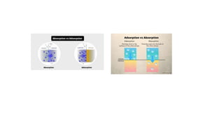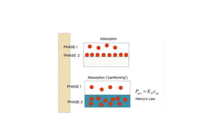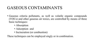 The document discusses various methods for controlling gaseous contaminants, including absorption, adsorption, condensation, and incineration. Absorption involves dissolving a gas in a liquid, such as water, through solubility and mass transfer. Adsorption accumulates molecules on surfaces through physical or chemical attraction. Condensation occurs when a gas changes to a liquid due to cooling and condensation nuclei. Incineration uses combustion and high temperatures to convert waste into ash, flue gas, and heat.