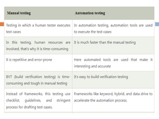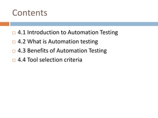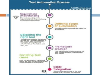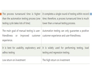 Automation testing refers to automatically testing software by writing test scripts that execute without human intervention. It automates repetitive test cases to reduce testing time and costs. Benefits include faster execution allowing for continuous integration and testing large data sets. Popular open-source tools like Selenium allow scripting in multiple languages while paid tools like UFT and TestComplete support both web and desktop testing. Key criteria for selecting a tool include skills, cost, features, support, and integration capabilities.