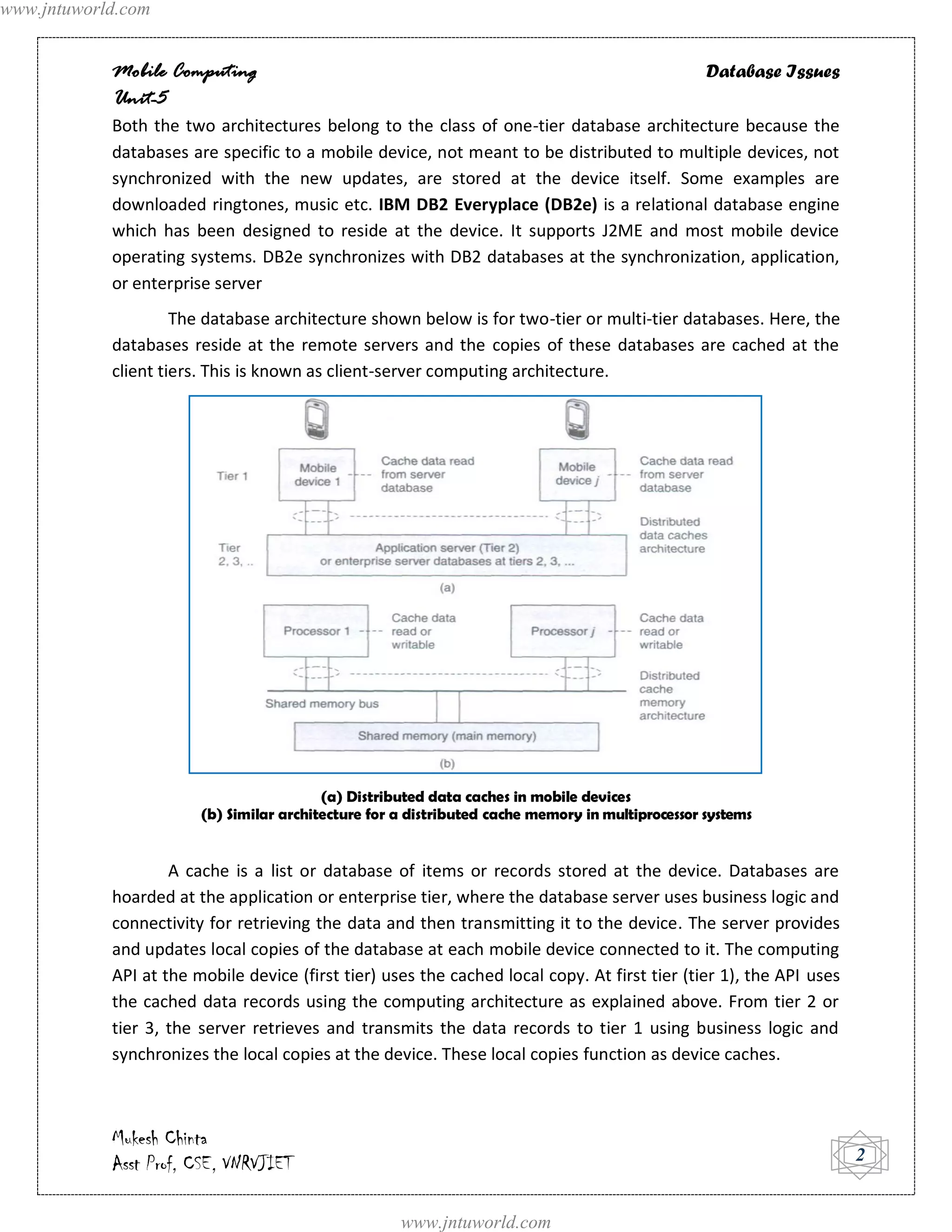 The document discusses database issues related to mobile computing. It describes how mobile devices cache data from servers to reduce latency when the device is offline. The cached data is stored locally in a process called hoarding. It discusses different database architectures and cache invalidation mechanisms used to maintain consistency between cached and server data. These include stateless asynchronous, stateful asynchronous, and stateful synchronous approaches. Maintaining cache consistency through invalidation reports and periodic updates is important for reliable usage of cached data on mobile devices.