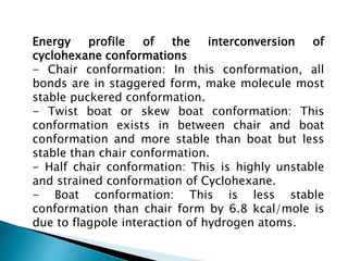 The document discusses cyclohexane conformations and Baeyer's strain theory. It explains that the chair conformation is the most stable configuration for cyclohexane, while the boat conformation is less stable due to steric interactions. Baeyer's strain theory postulates that deviations from ideal tetrahedral bond angles impose strain on a molecule, with greater deviations resulting in greater instability. The theory explains the reactivity of small ring cycloalkanes like cyclopropane.