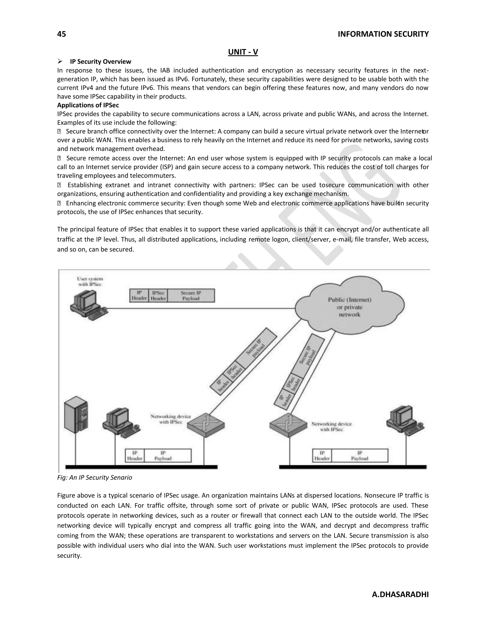 The document discusses IP Security (IPSec) which provides security features at the IP layer. It describes the various IPSec documents and standards. It explains the key concepts of IPSec including security associations (SA), transport and tunnel modes, the Authentication Header (AH) and Encapsulating Security Payload (ESP). AH provides authentication and data integrity while ESP provides encryption and optional authentication. IPSec can be used to secure communications across networks in various scenarios such as remote access and extranet connectivity.