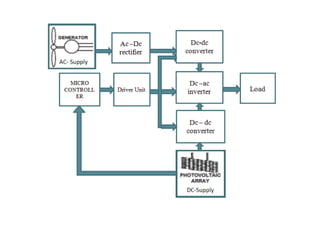 This document discusses grid-tied hybrid renewable energy systems. It provides details on how hybrid systems that combine sources like solar, wind and diesel generators can provide power to homes and businesses while also feeding excess electricity back to the main power grid. The key aspects covered include how grid-tied systems work, the components involved like inverters, the advantages of net metering arrangements, different hybrid configuration options, and maximum power point tracking technology to optimize renewable energy output.