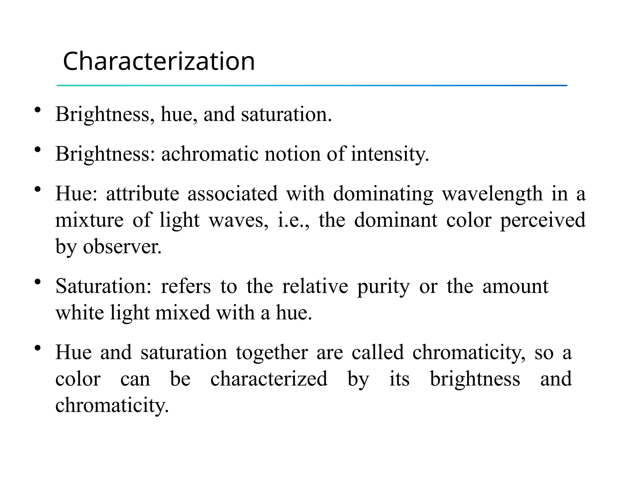 The document discusses color theory, outlining primary and secondary colors, and their characteristics such as brightness, hue, and saturation. It describes various color models including RGB, CMY, CMYK, HSI, HSV, and HLS, along with detailed conversion formulas and examples between RGB and CMY models. Additionally, it provides calculations related to image size and pixel color intensity in digital images.