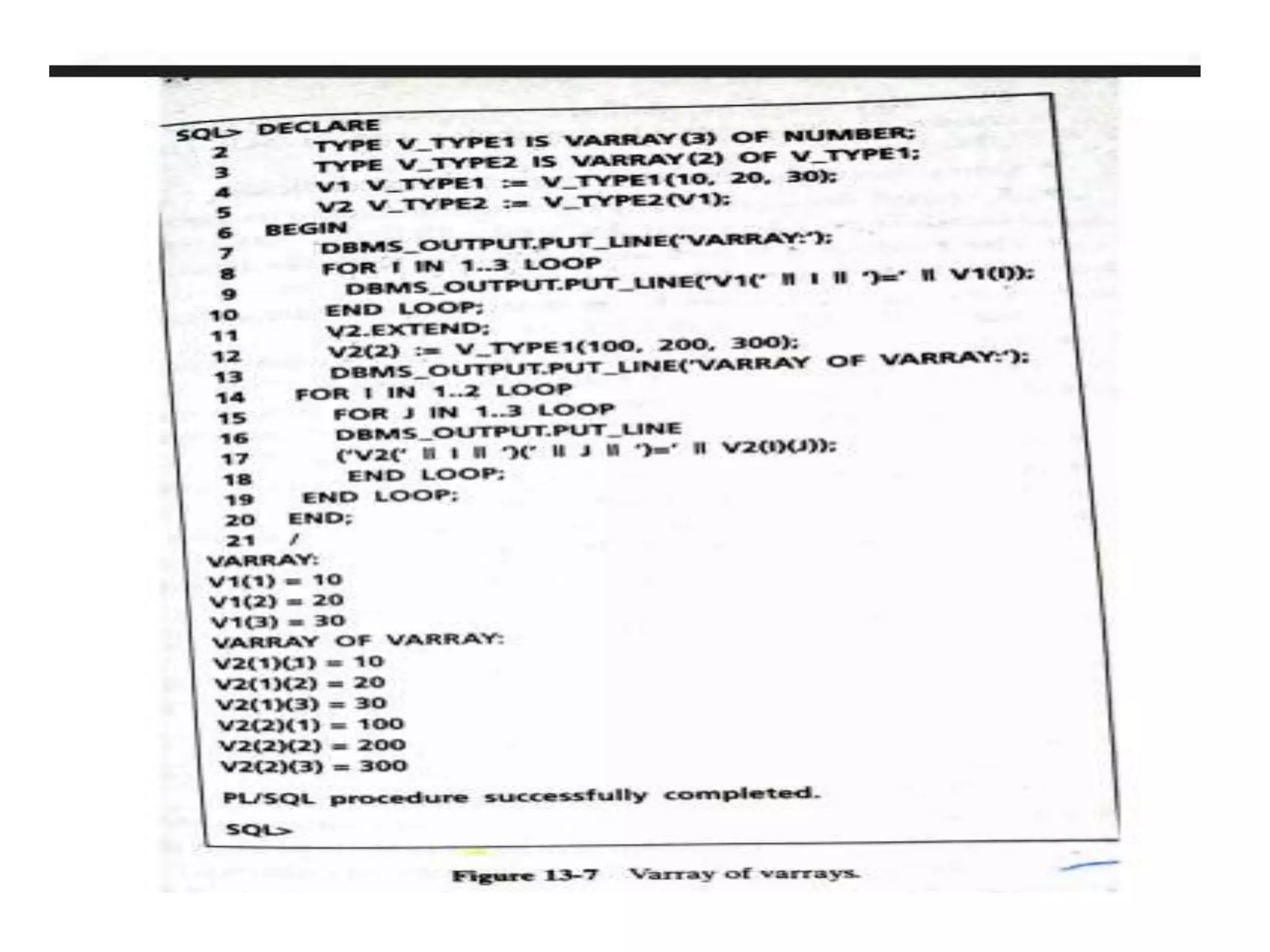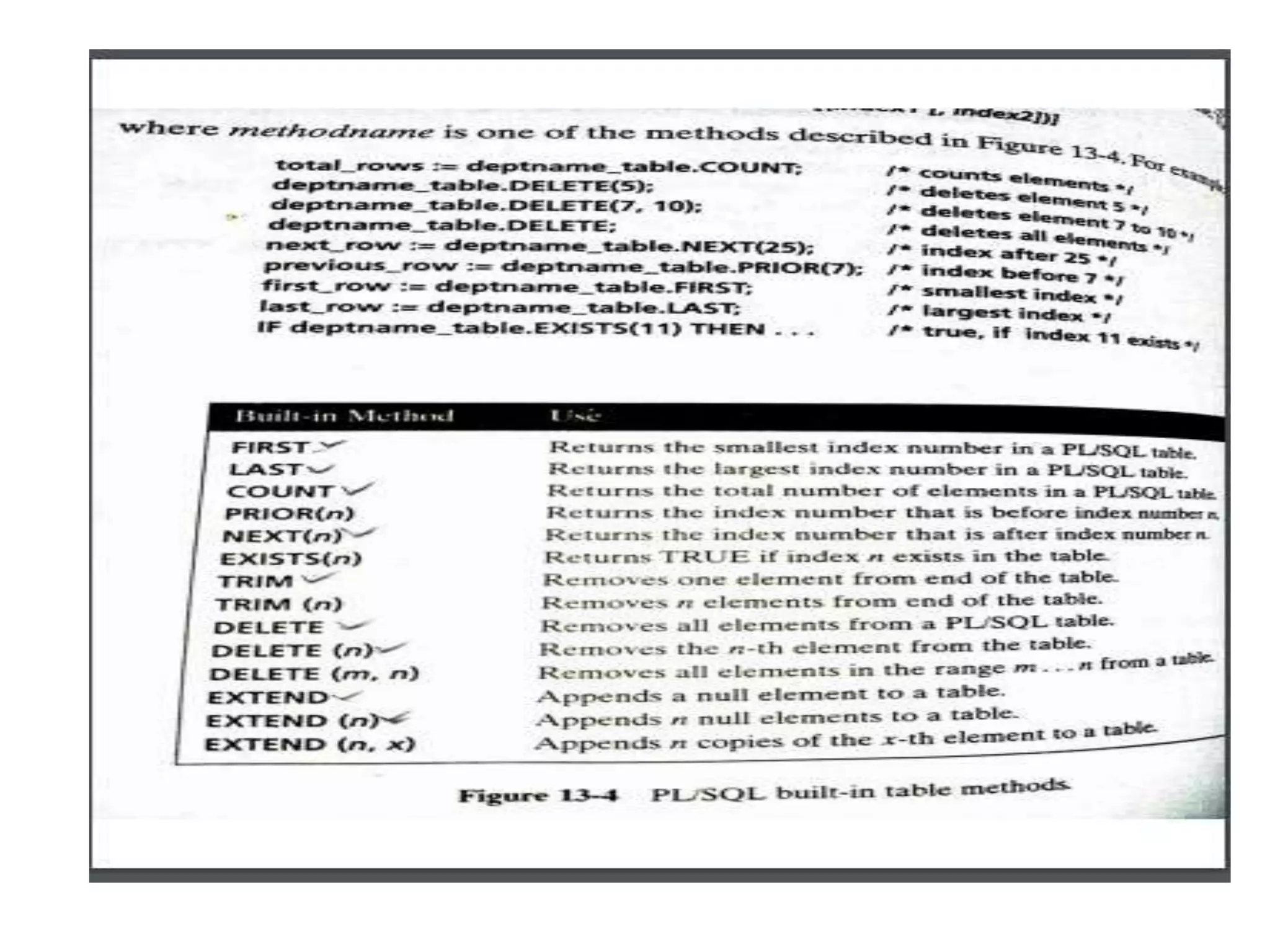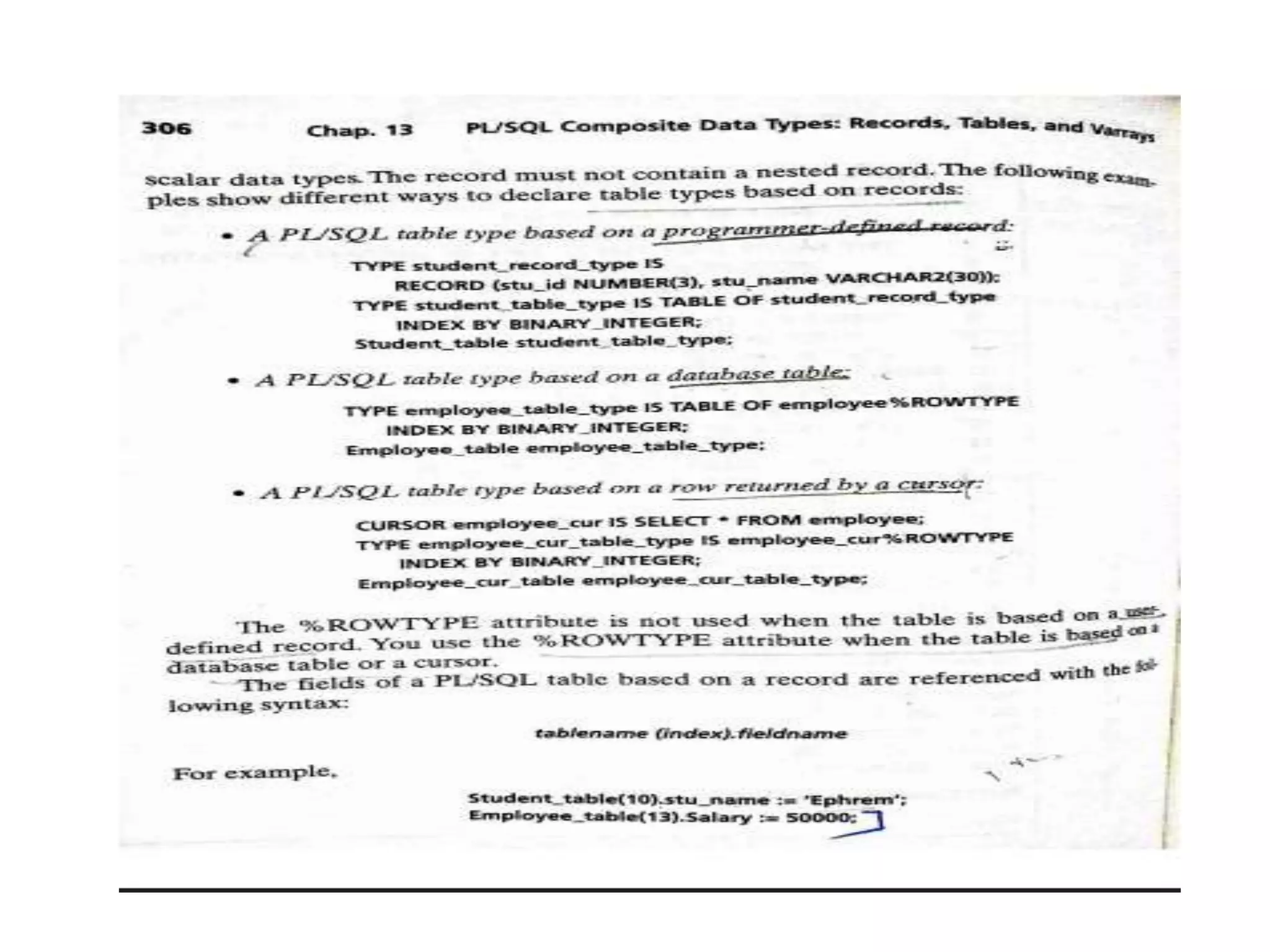 This document discusses composite data types in PL/SQL such as records, tables, nested records, and variable-sized arrays (varrays). Records are similar to rows in database tables and can contain fields of scalar or other composite types. Tables are collections of elements of the same type indexed by numbers. Nested records allow records to be included as fields within other records. Varrays are single-dimensional arrays with a bounded size. Procedures and functions are used to modularize PL/SQL code.