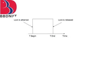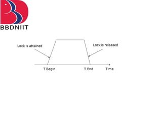 The document discusses concurrency control techniques in database management systems, highlighting problems such as lost updates, dirty reads, and unrepeatable reads. It explains several protocols for concurrency control, including lock-based, timestamp ordering, and validation-based protocols, each with its unique methods for ensuring transaction integrity and consistency. Additionally, it defines concepts like multiple granularity and checkpoints to facilitate recovery during concurrent transactions.