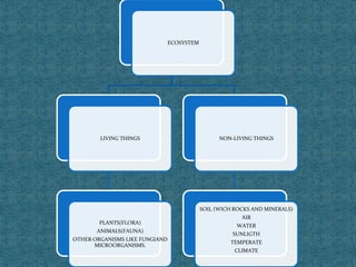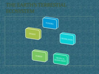 This document summarizes different ecosystems around the world including tundra, grasslands, forests, deserts, aquatic ecosystems, and artificial ecosystems. It describes key characteristics of each ecosystem such as location, climate, common plant life, and animal species found in each ecosystem. The document provides information on different types of grasslands, forests, and aquatic ecosystems. It also discusses artificial ecosystems that have been created by humans including farms, gardens, and cities.